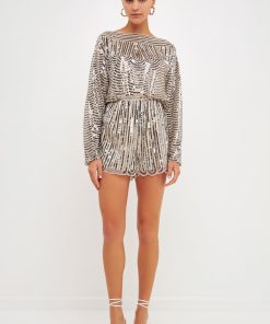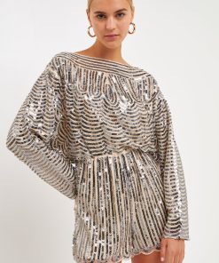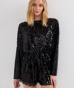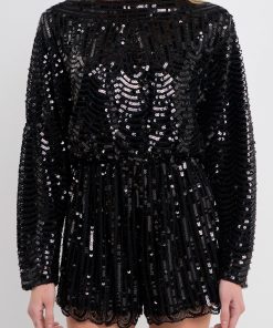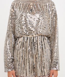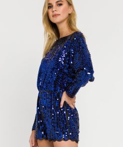 This glamorous Boat Neck Sequin Romper is the ideal party-ready piece. It features all-over sequin and bead embellishments for maximum sparkle. The boat neck is complemented with elastic band at the waist and long sleeves. With its luxury detailing this is the perfect glitzy addition to any woman’s wardrobe.