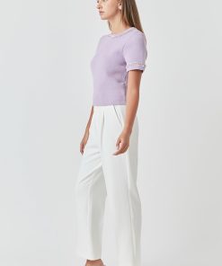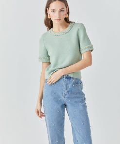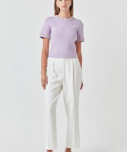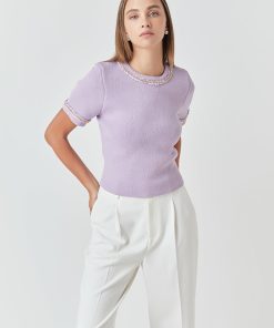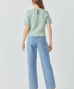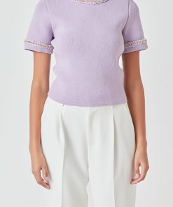 This Chain Trim Knit Short Sleeve Top is the perfect combination of comfort and style. The round neckline and short sleeves are designed with a ribbed detail for an elevated look. The back features a keyhole closure for a modern silhouette. A must-have for your wardrobe.