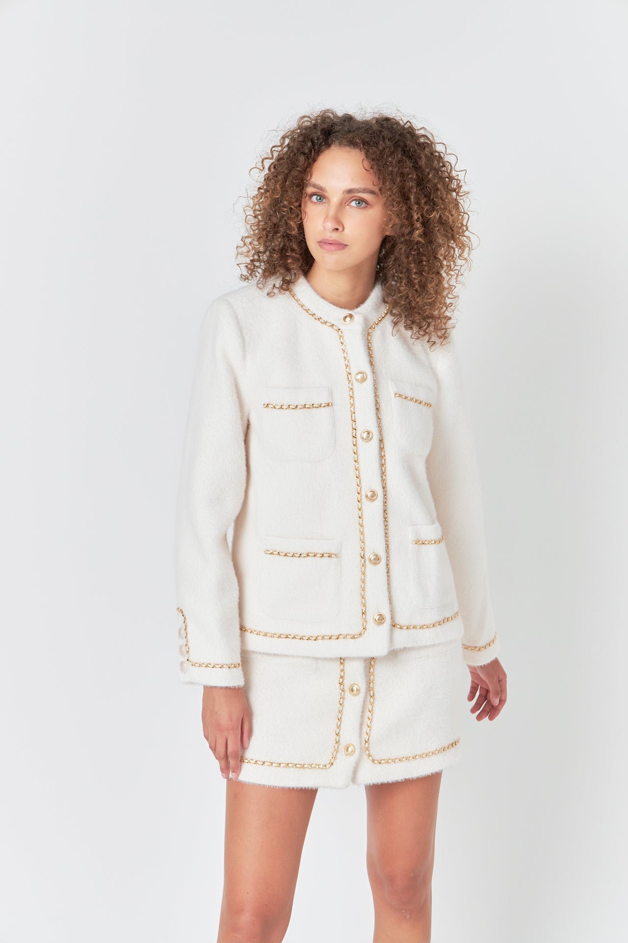 Be the centre of attraction with our stylish Chain Trimmed Jacket! This fashionable jacket is made from a fuzzy texture fabric and features a regular fit with a round neckline. The long sleeves add to the overall look while the golden chain trim lends a classy touch. Perfect for any season and occasion this jacket is sure to set you apart from the rest. Get ready to make an impression with our fashionable and stylish Chain Trimmed Jacket.