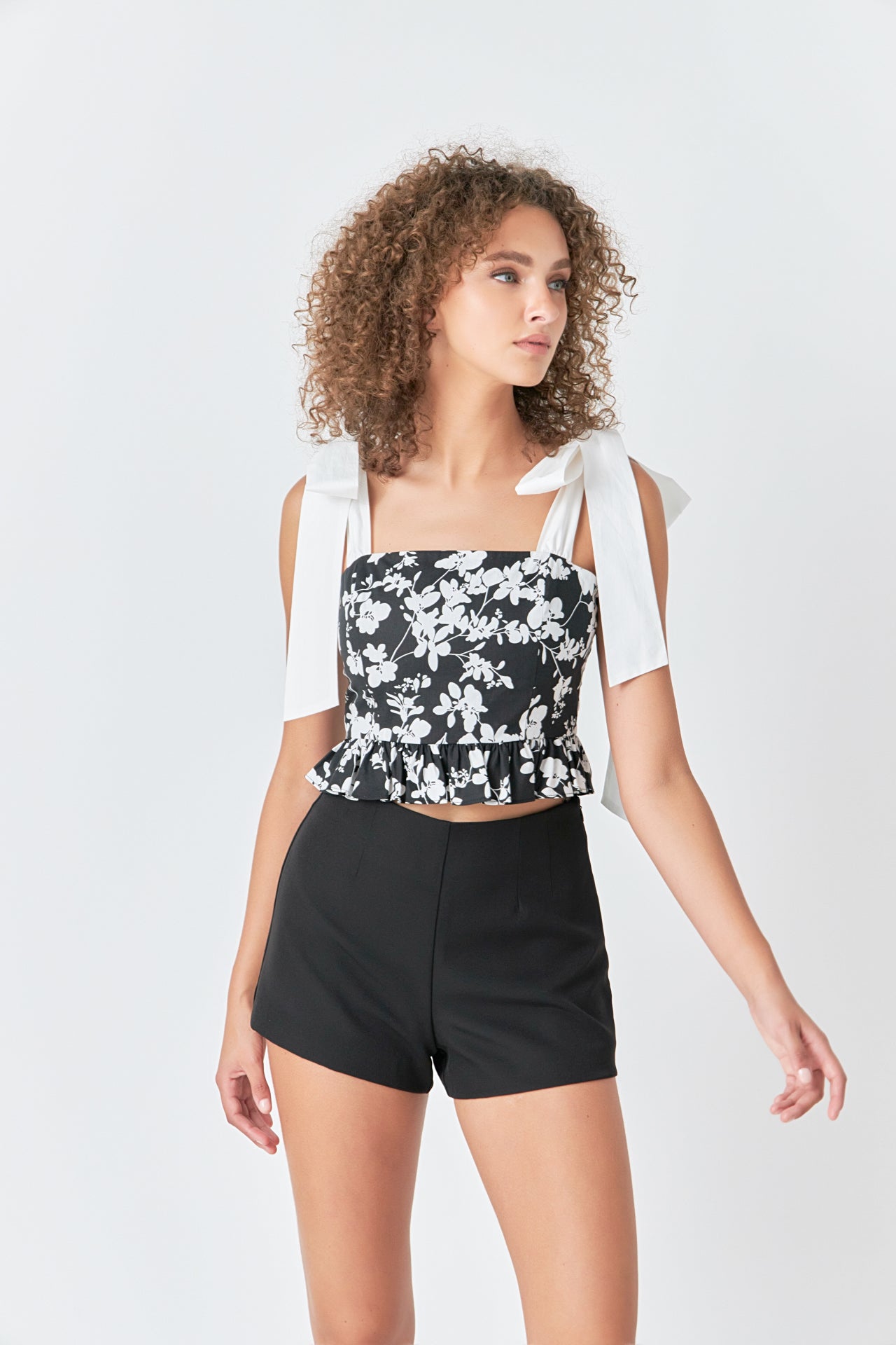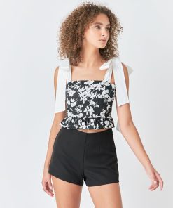 This Contrast Bow Strap Printed Top is the perfect combination of style and comfort. Featuring a floral print solid shoulder bow tie detail square neckline and a cropped length this peplum ruffle top is sure to make a statement. Wear to work or to an evening out and turn heads everywhere you go.