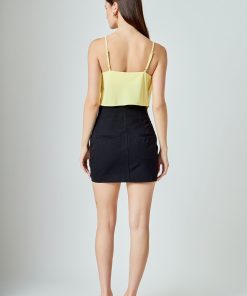 A cropped camisole with adjustable spaghetti straps and a cowl neck.
