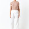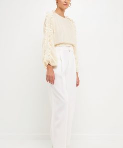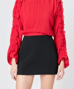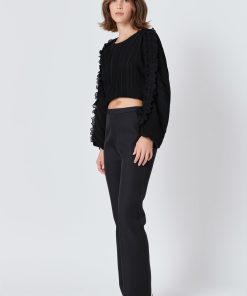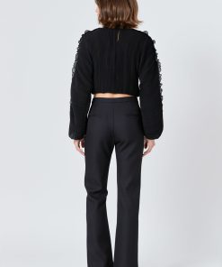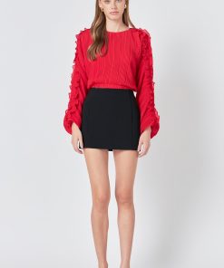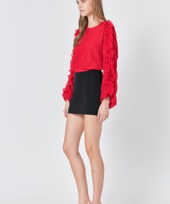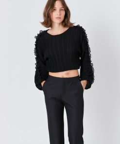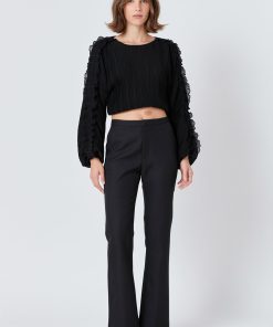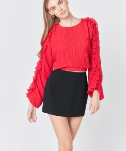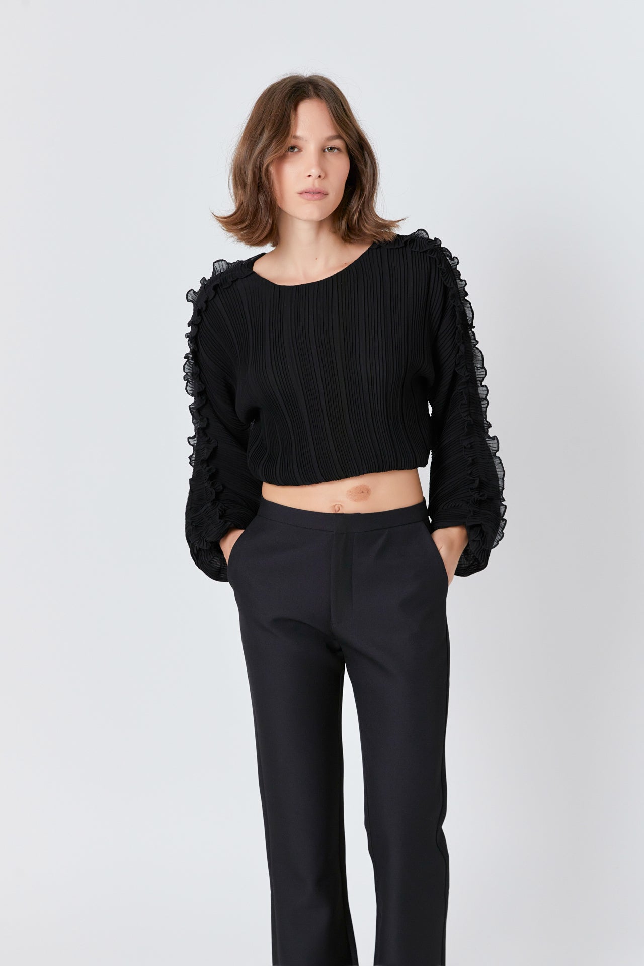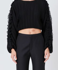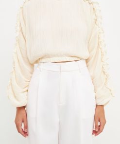 This cropped blouse is made with a sheer plisse fabric and features ruffle detailing on the sleeves. The elastic waistband provides a comfortable fit.