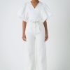 This cropped blouse is made with a sheer plisse fabric and features ruffle detailing on the sleeves. The elastic waistband provides a comfortable fit.