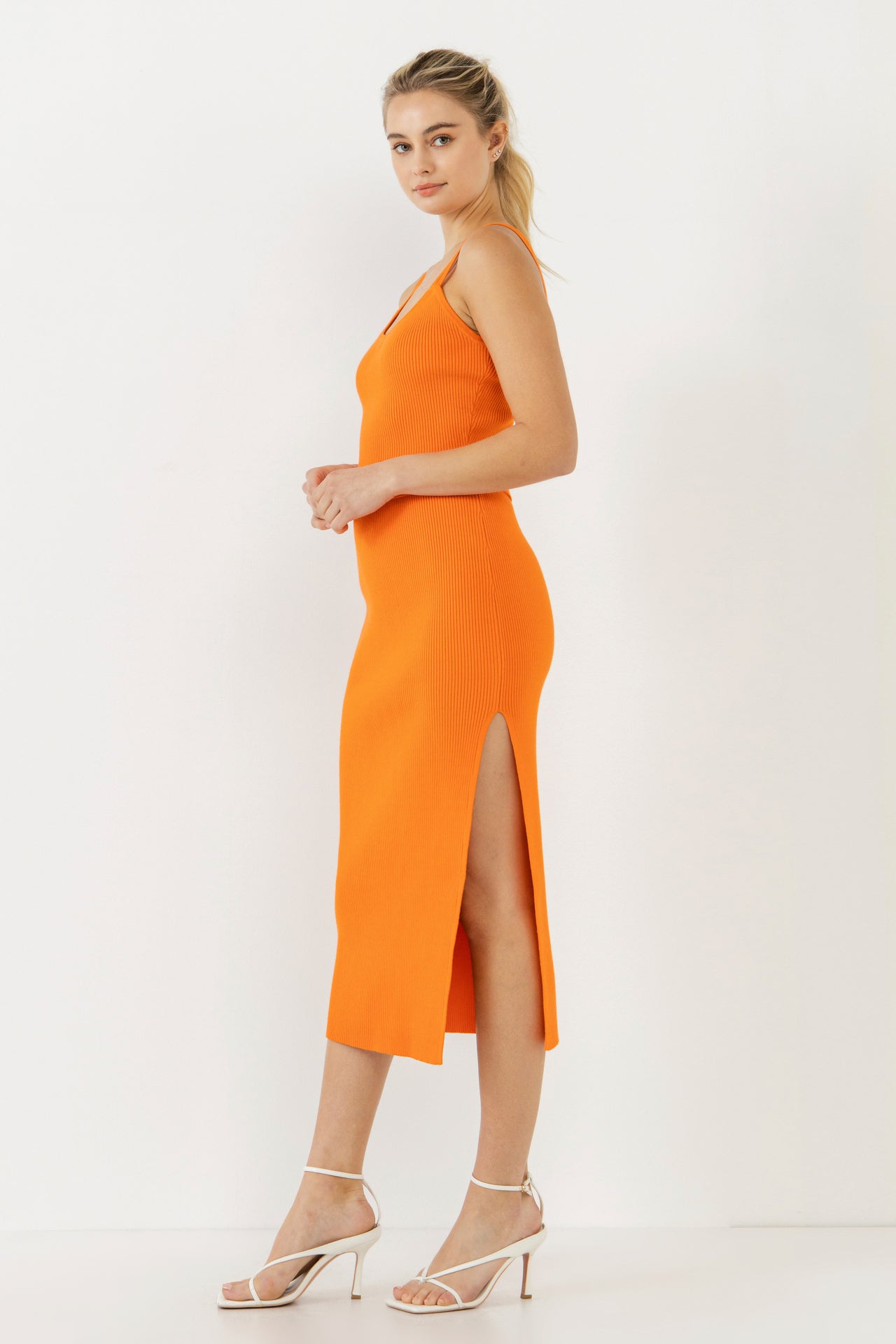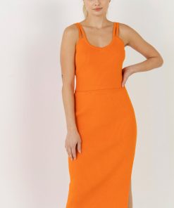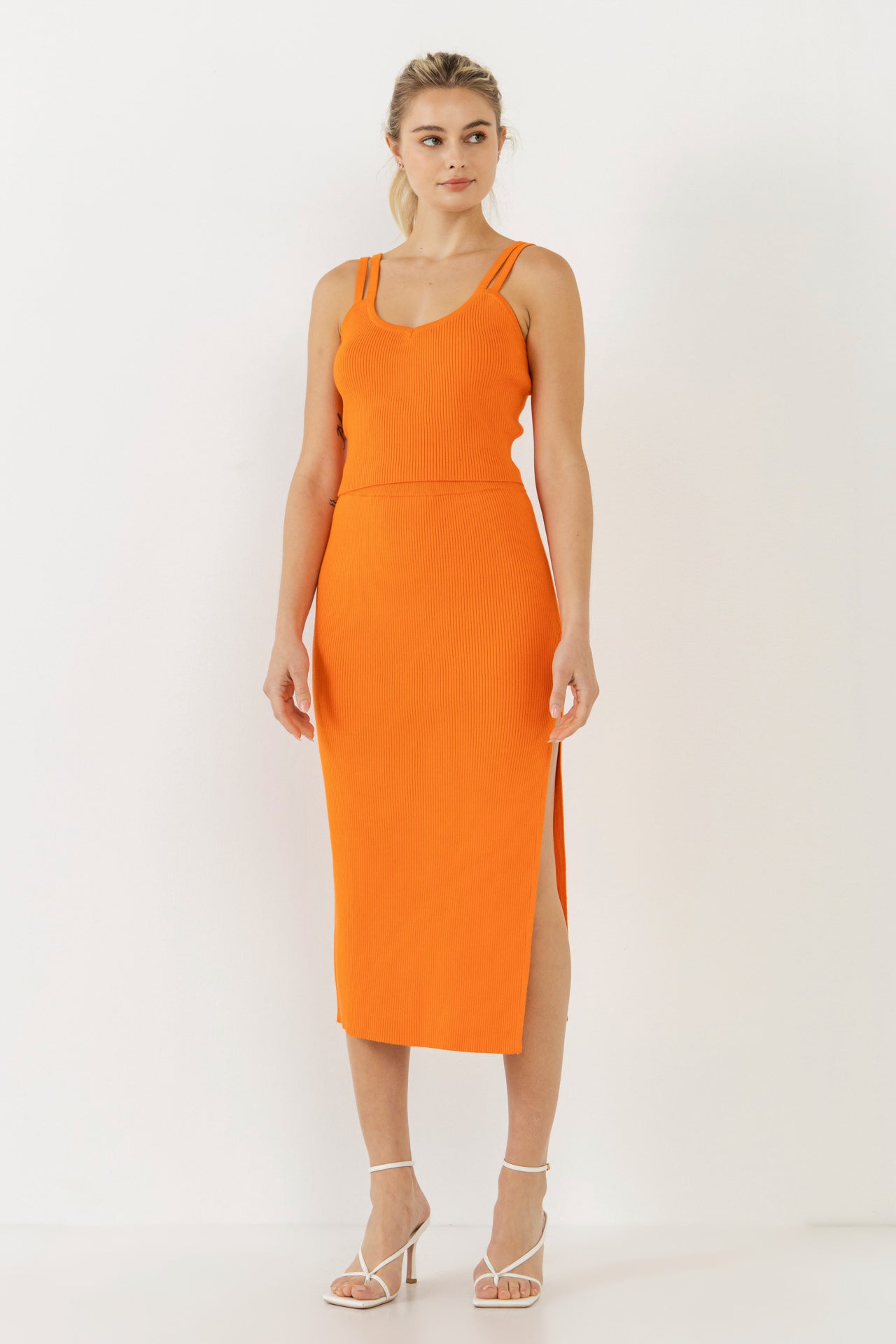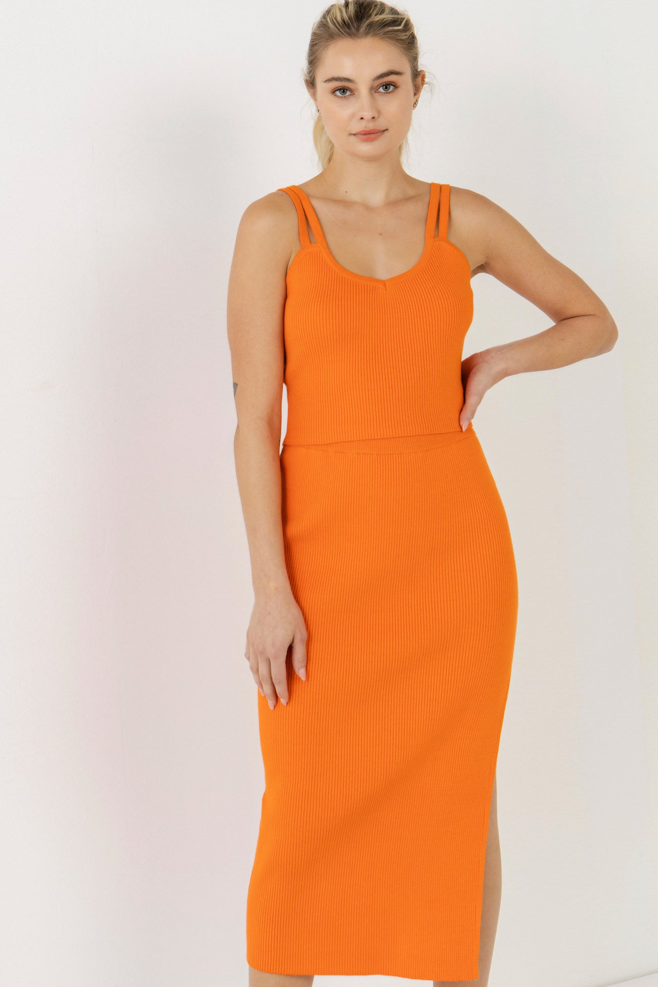 This Double Shoulder Strap Cropped Knit Cami Top is the perfect addition to your summer wardrobe! The orange crop top features two shoulder straps and a comfortable knit fabric, making it perfect for a day out in the sun. Style with our matching midi skirt, or pair with a mini skirt or any jeans.