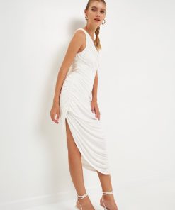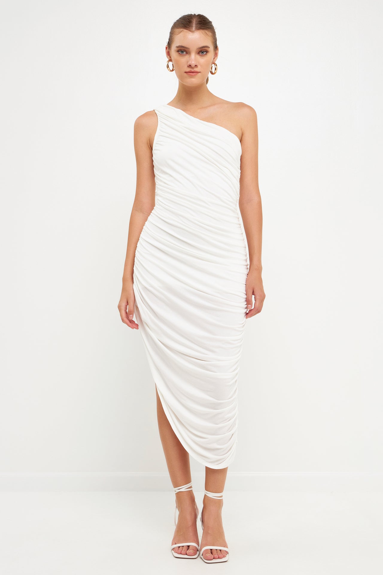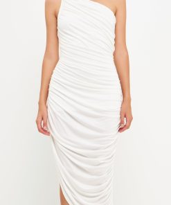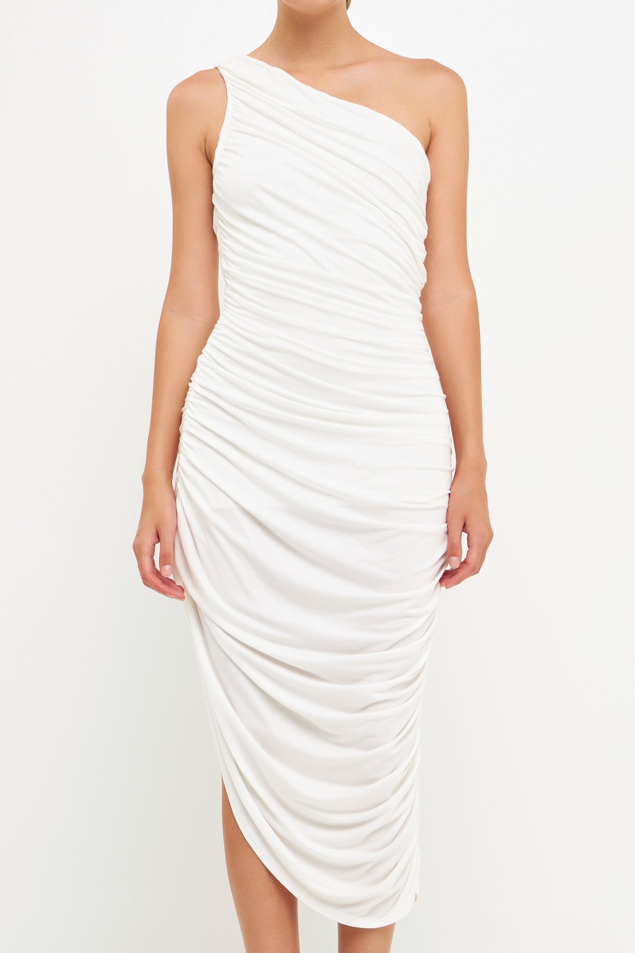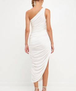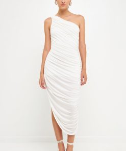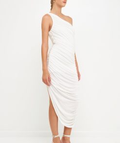 Still looking for the perfect evening dress? Look no further than this asymmetrical jersey dress. With an off-shoulder neckline a shirred side seam and an opened detail slit on one side this classic fit maxi dress is sure to turn heads. Effortlessly combine style and comfort with this irresistibly sleek and timeless sleeveless dress.