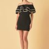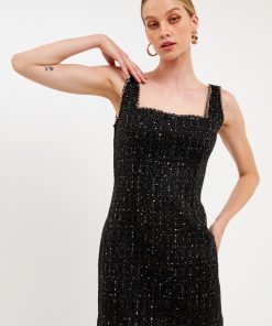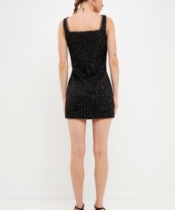This sequin tweed mini dress is accented with a chain trim, which is made from a high-quality faux leather strip and gold chain.