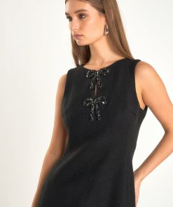 Elevate your style with our stunning Cleo Bow Embellished Tweed Sleeveless Mini Dress. The sleek and chic mini length is perfect for any occasion, while the charming bow detail adds a touch of femininity. Designed with a classic round neckline and sleeveless silhouette, this dress is a must-have in your wardrobe. Its intricate design and high-quality fabric make it a standout piece, sure to turn heads. Whether it’s a brunch date or a night out, this dress will have you looking effortlessly glamorous. Shop now and complete your ensemble with our Cleo Bow Embellished Tweed Sleeveless Mini Dress.