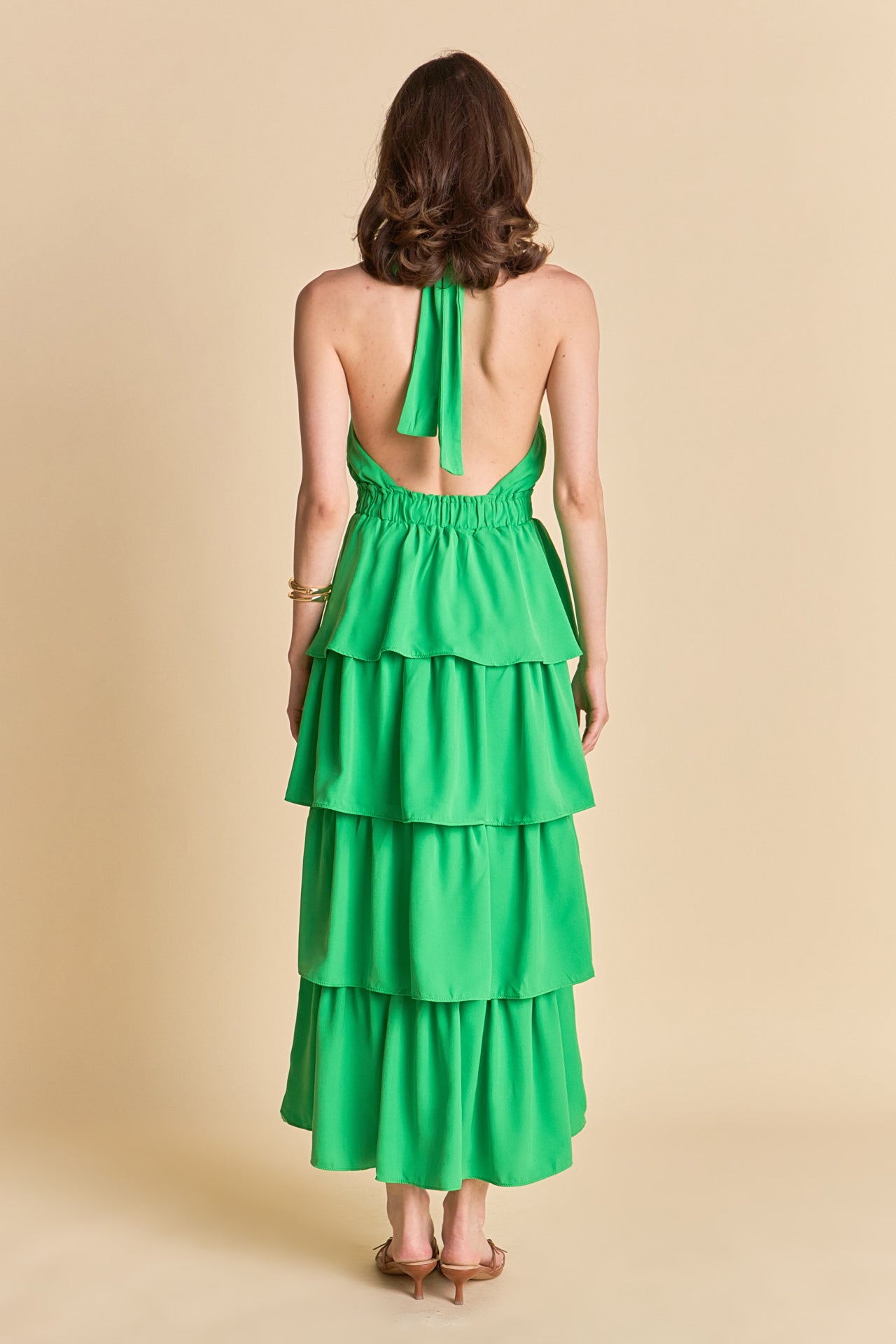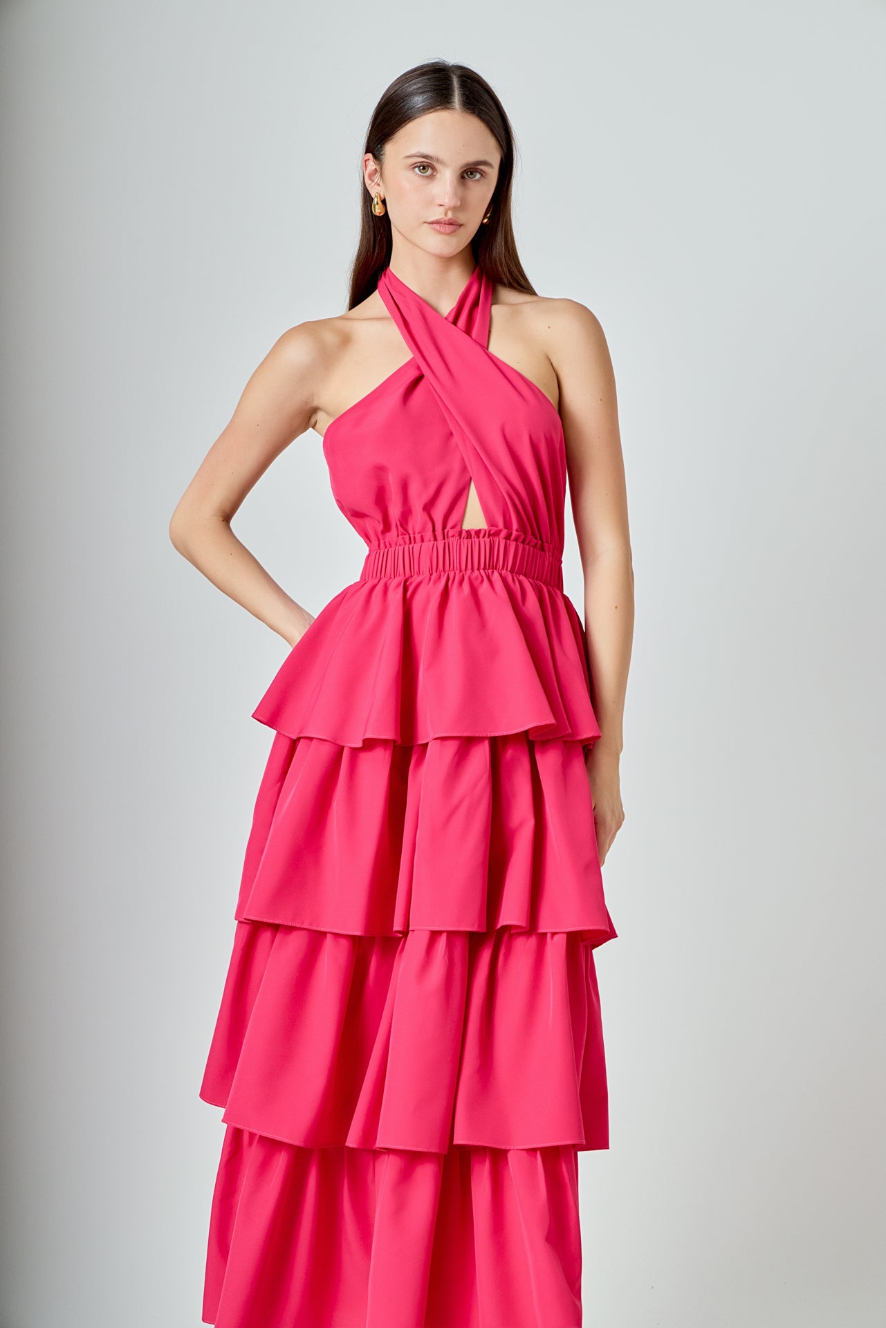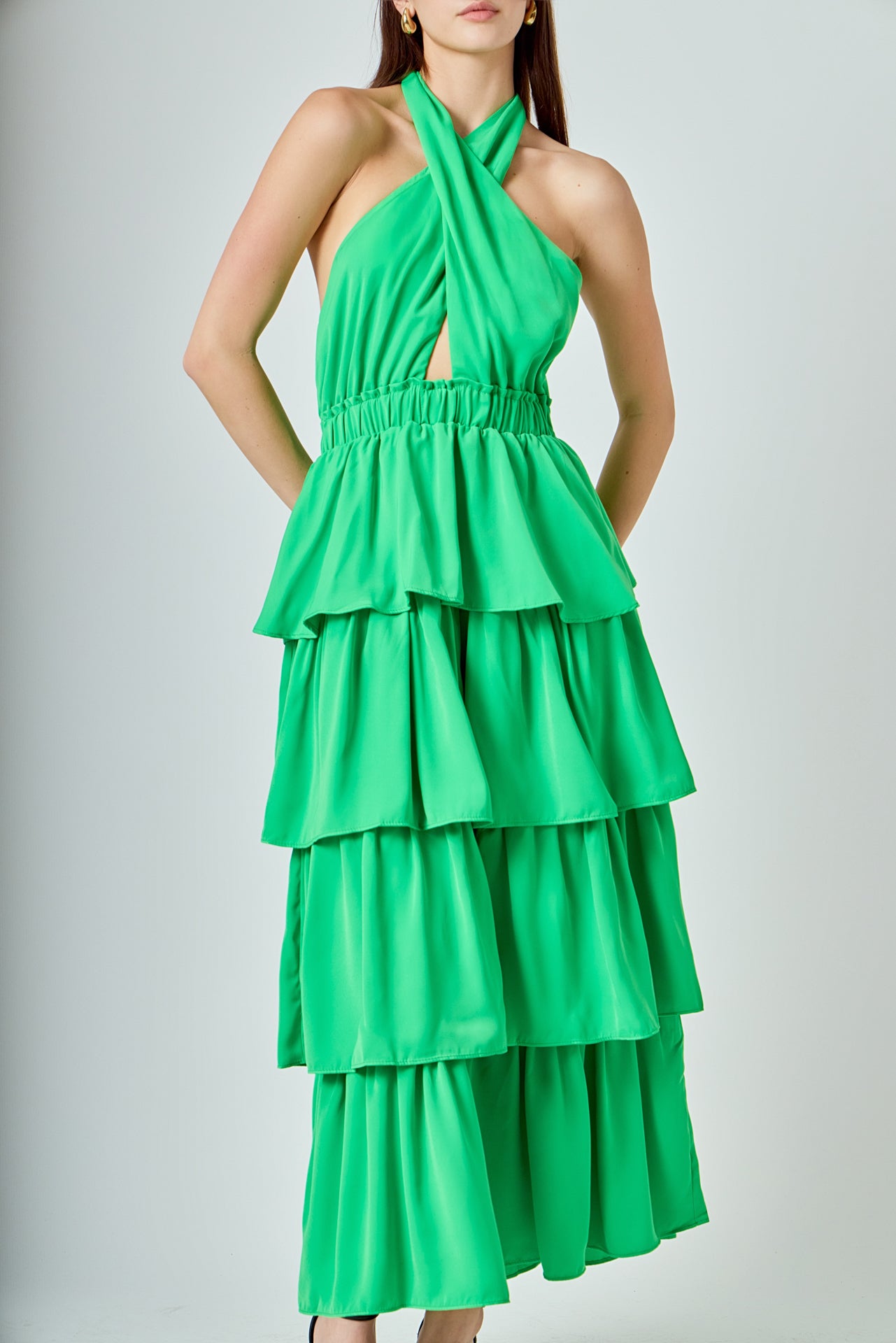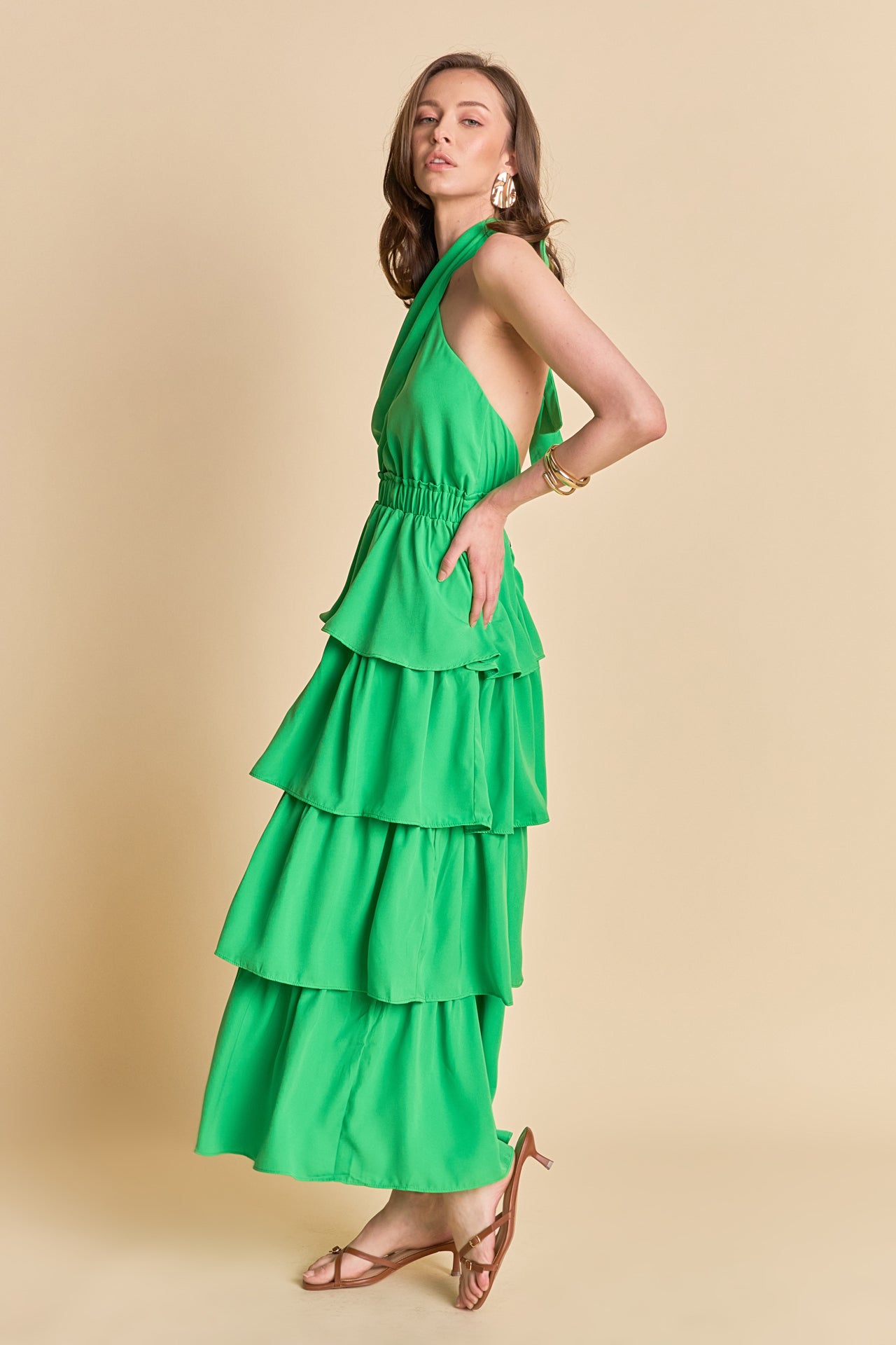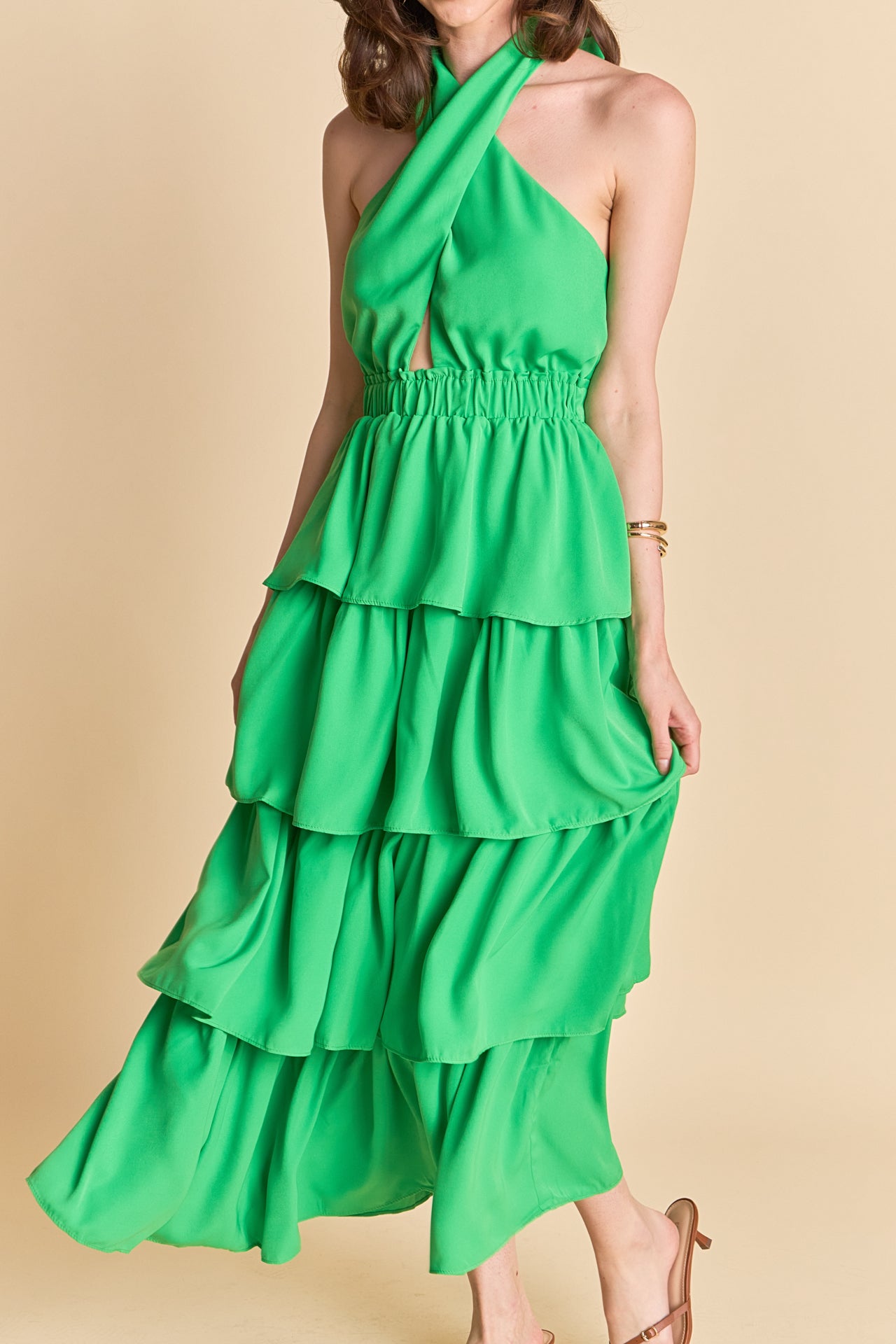 This dress is a must-have for your summer wardrobe! It features a crossed halter neckline, an elastic waist for a comfortable fit, and tiered maxi skirt. Plus, the open back and tiered ruffles provides a flirty finish.