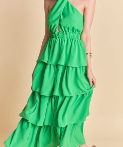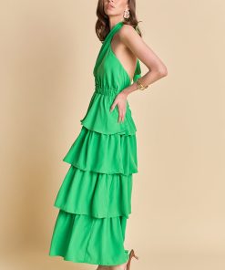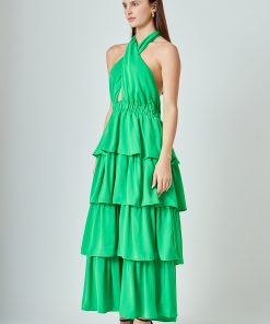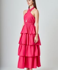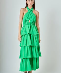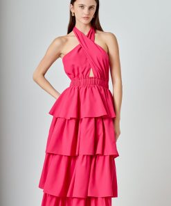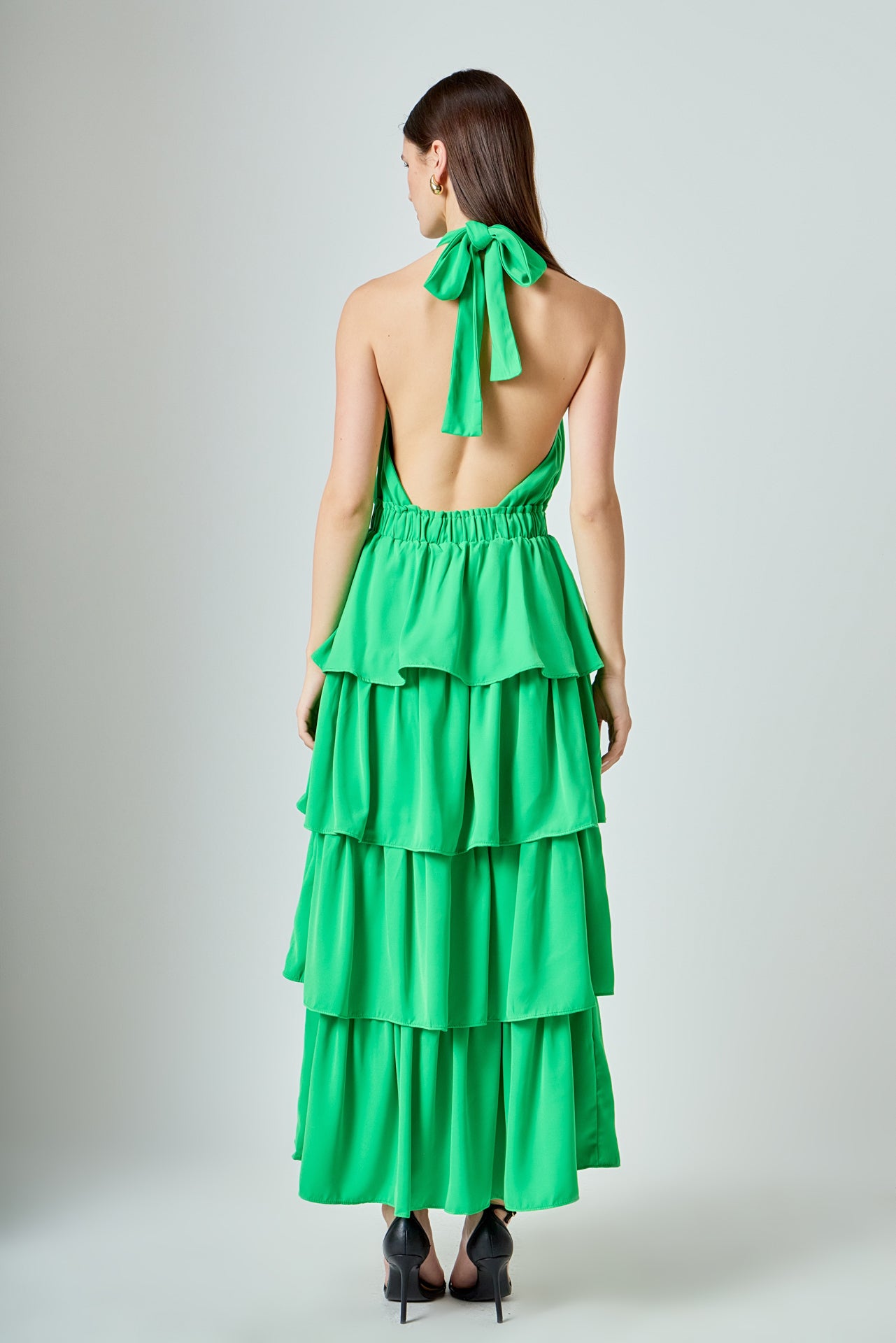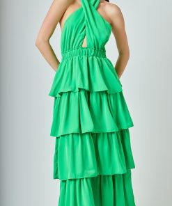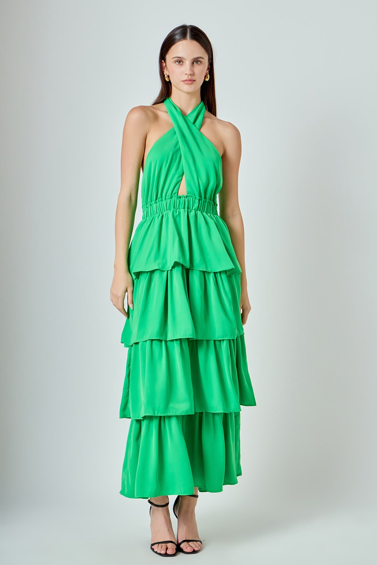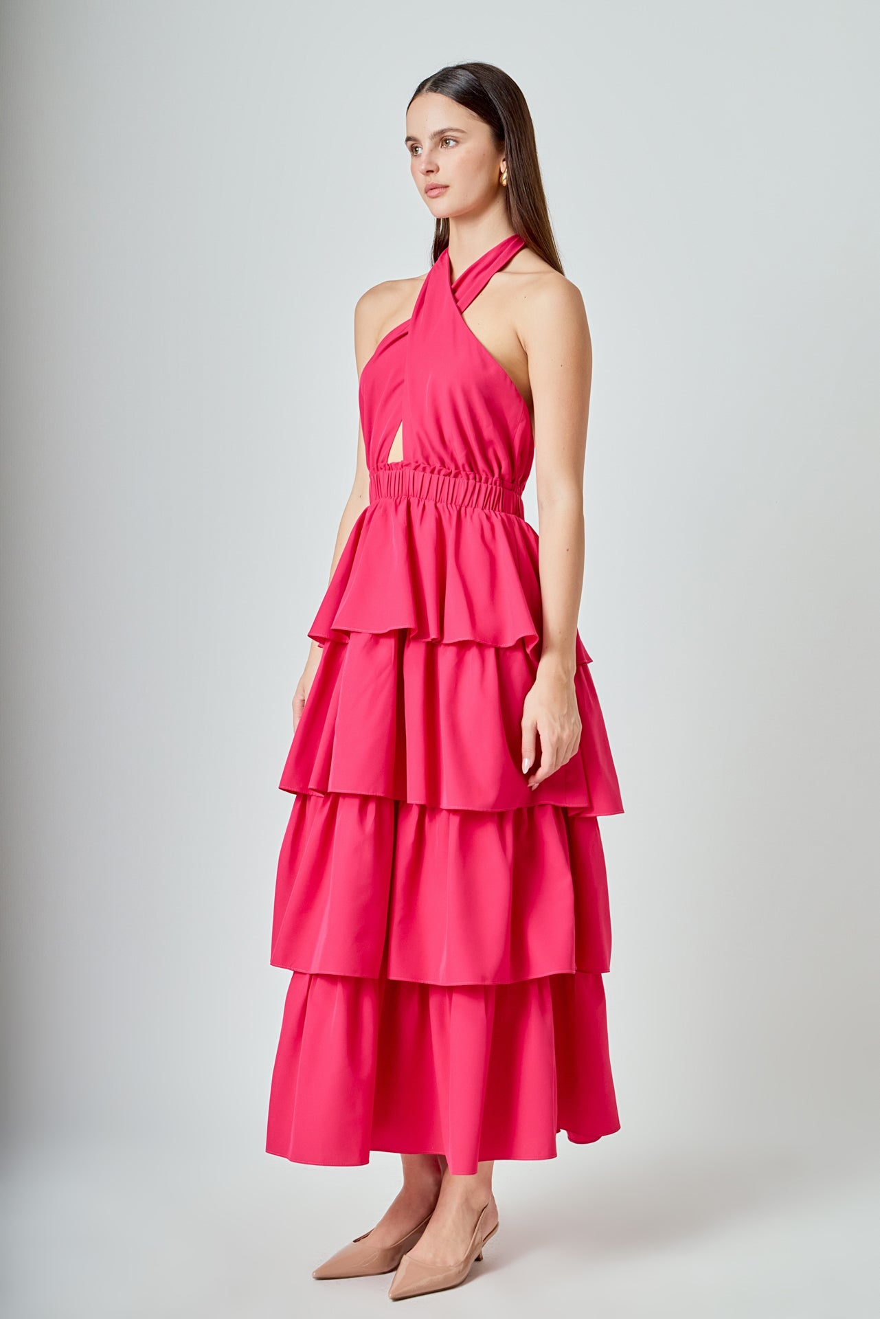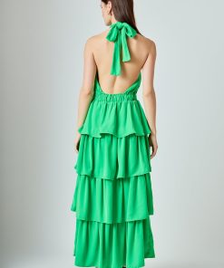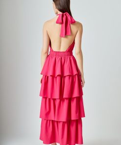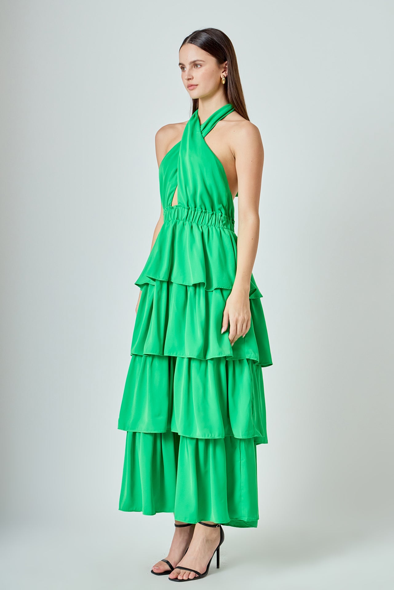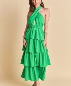 This dress is a must-have for your summer wardrobe! It features a crossed halter neckline, an elastic waist for a comfortable fit, and tiered maxi skirt. Plus, the open back and tiered ruffles provides a flirty finish.