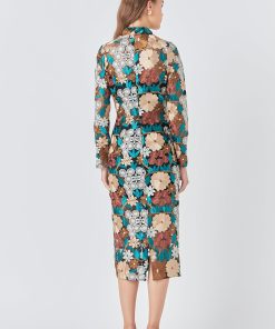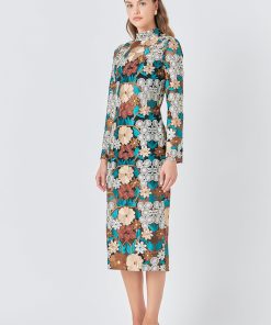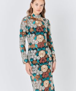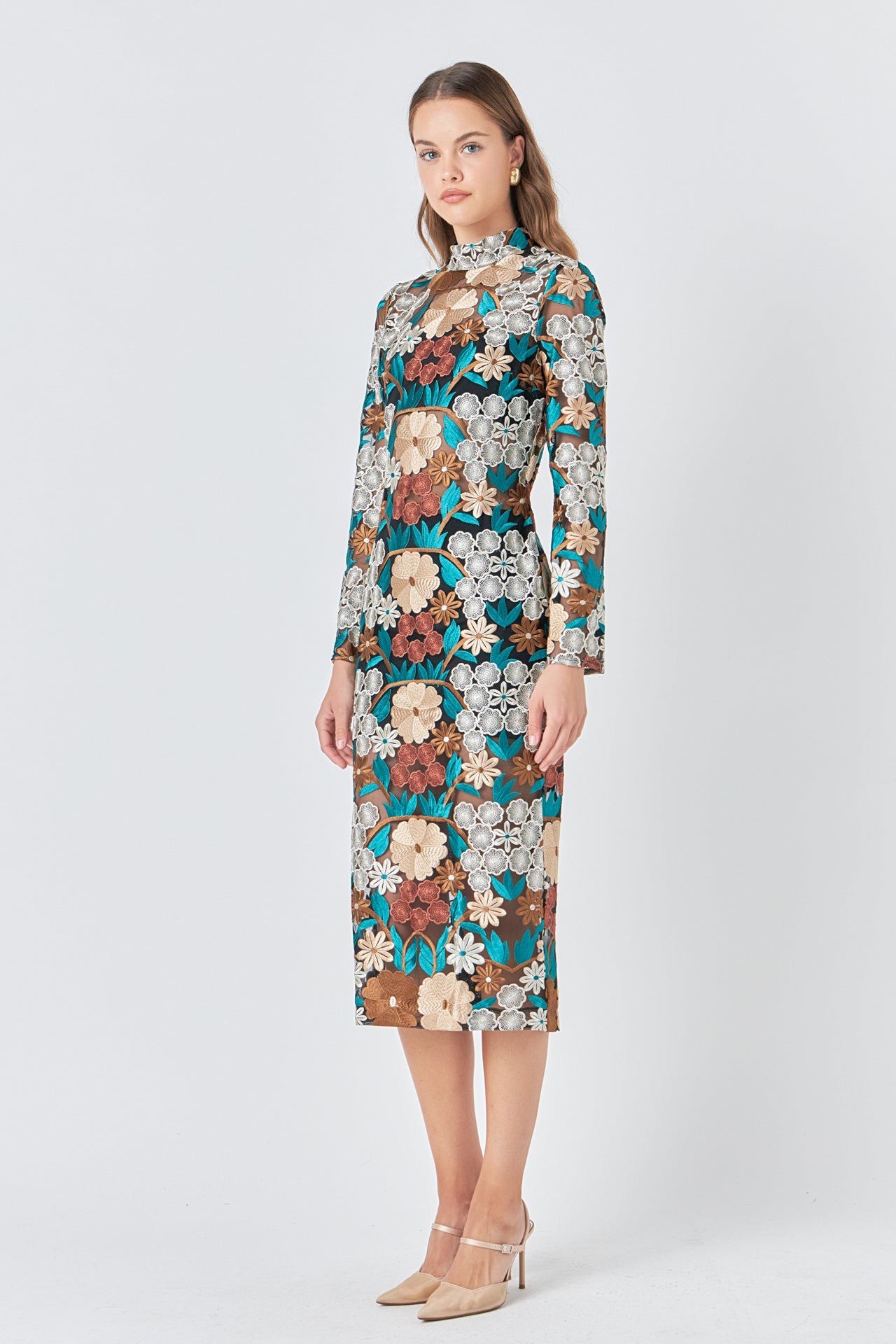 This beautiful Floral Embroidered Midi Dress will complete any look. With a fitted silhouette and midi length it features a mockneck and eye-catching embroidery. Perfect for special occasions this elegant dress is sure to be a wardrobe favorite. Get this stunning dress today to express your own unique style.