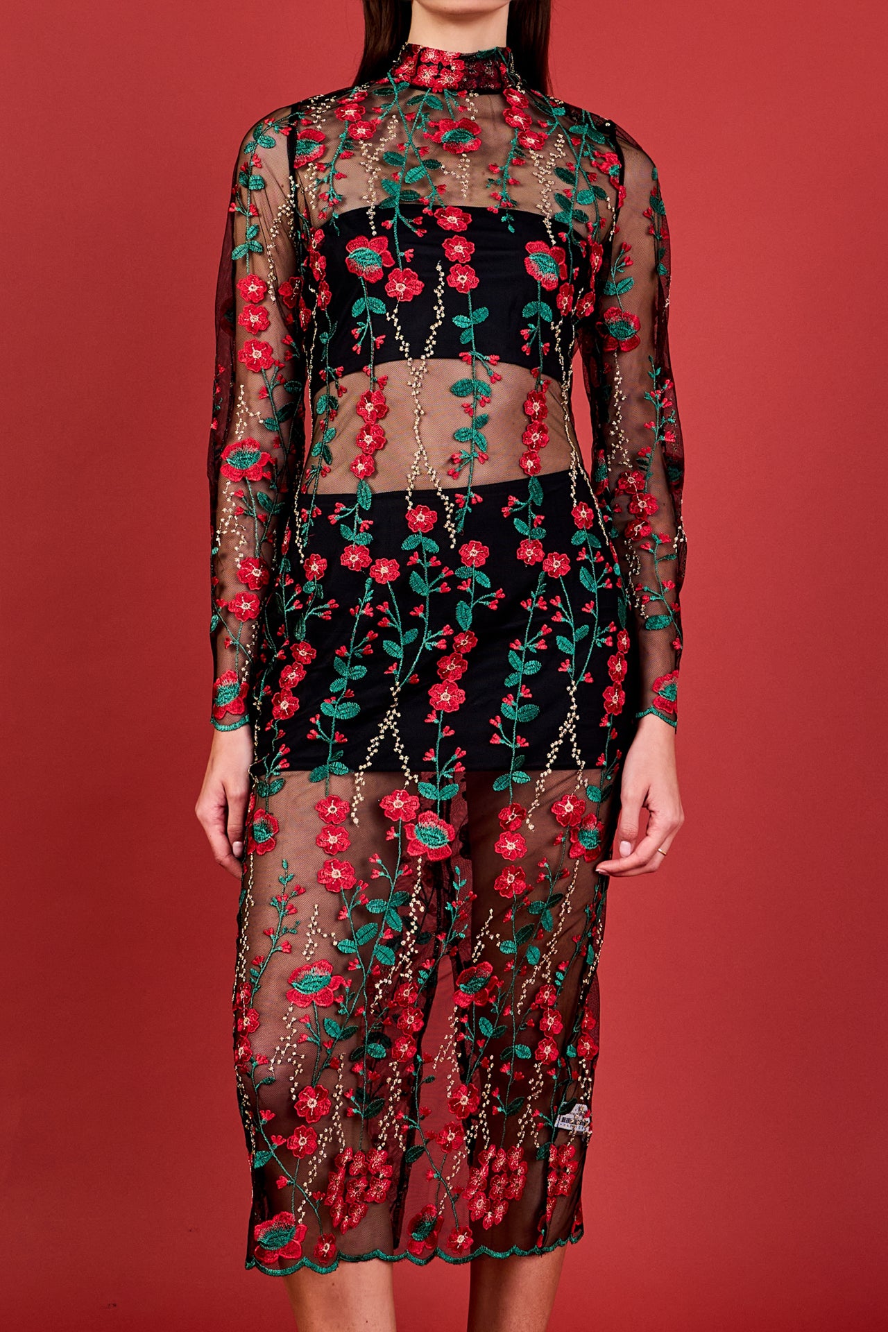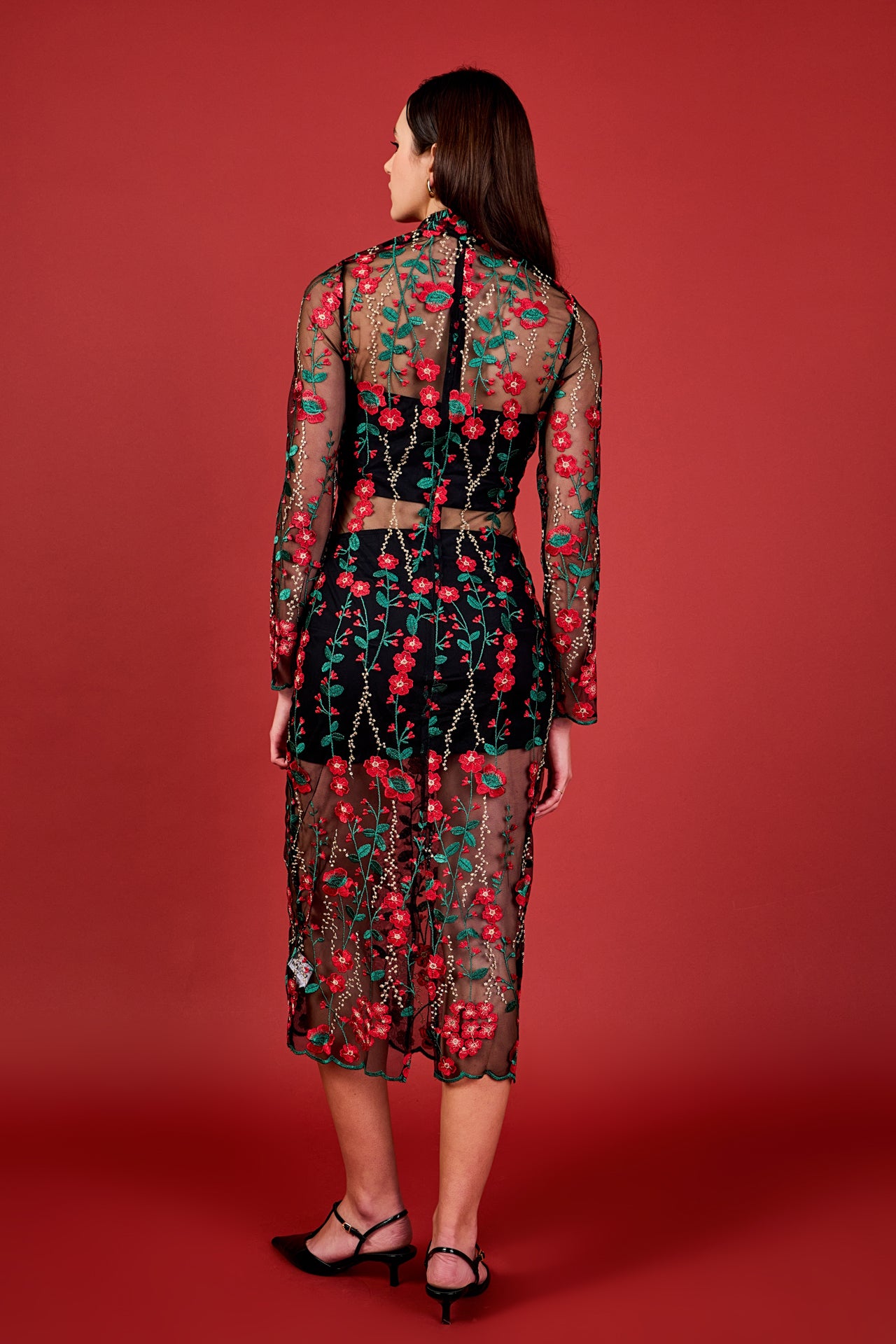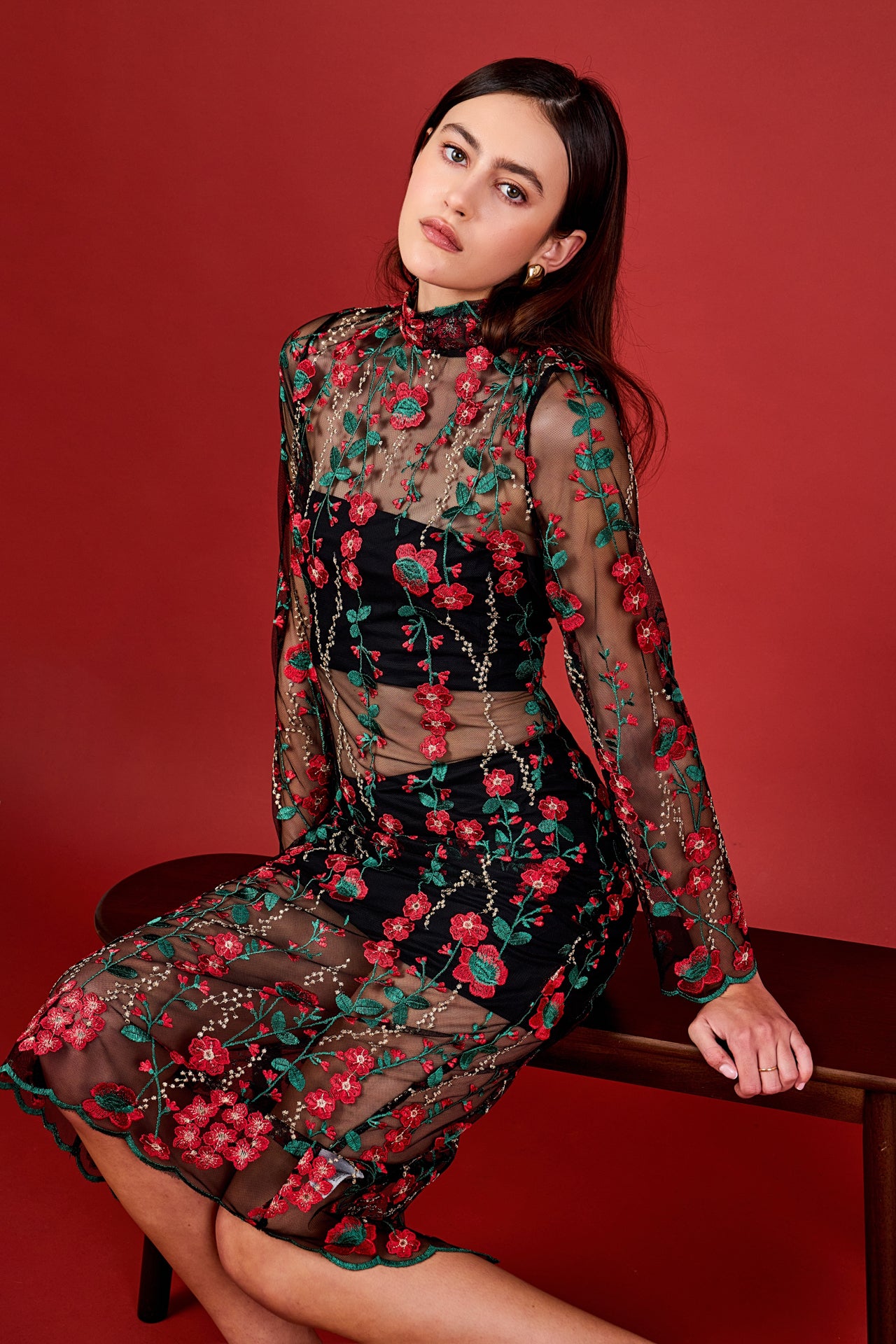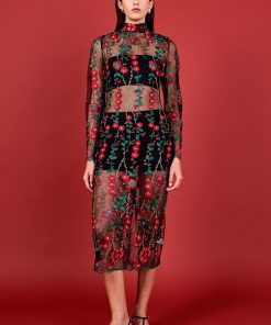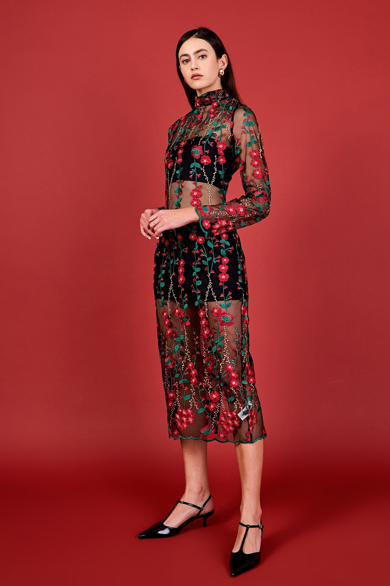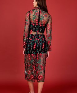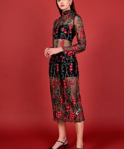 This beautiful Floral Embroidered Midi Dress will complete any look. With a fitted silhouette and midi length it features a mockneck and eye-catching embroidery. Perfect for special occasions this elegant dress is sure to be a wardrobe favorite. Get this stunning dress today to express your own unique style.