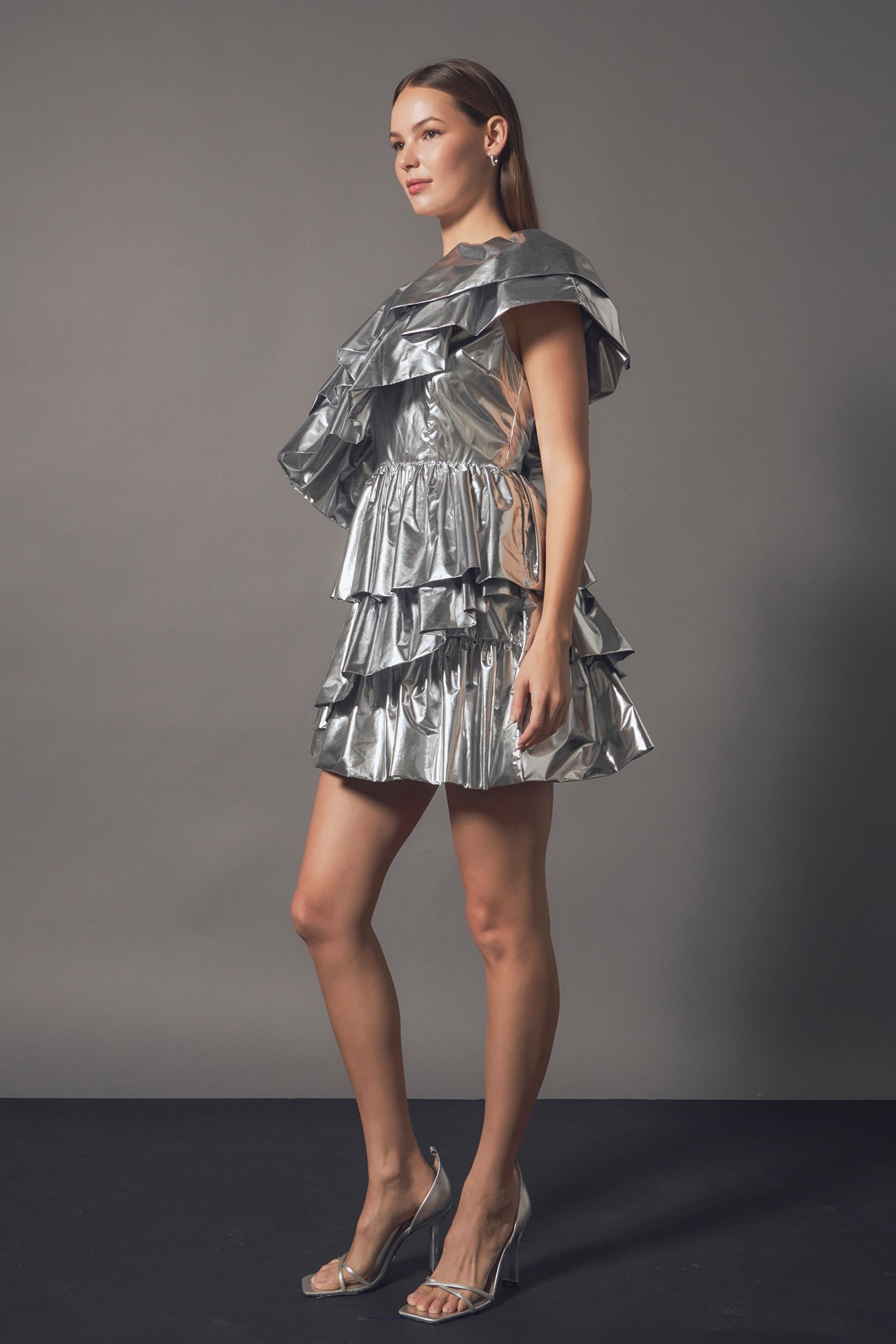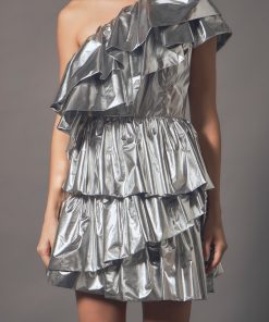 Fashion a look of pure elegance and style in this Metallic Tiered Mini Dress. This one-shoulder dress features an alluring tiered mini length design, designed to flatter all body types and create a stunning silhouette. This sparkling metallic fabric with flattering folds is the perfect way to turn heads and make an impression. With its luxurious design this is the perfect statement piece to show off your unique style.