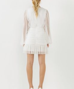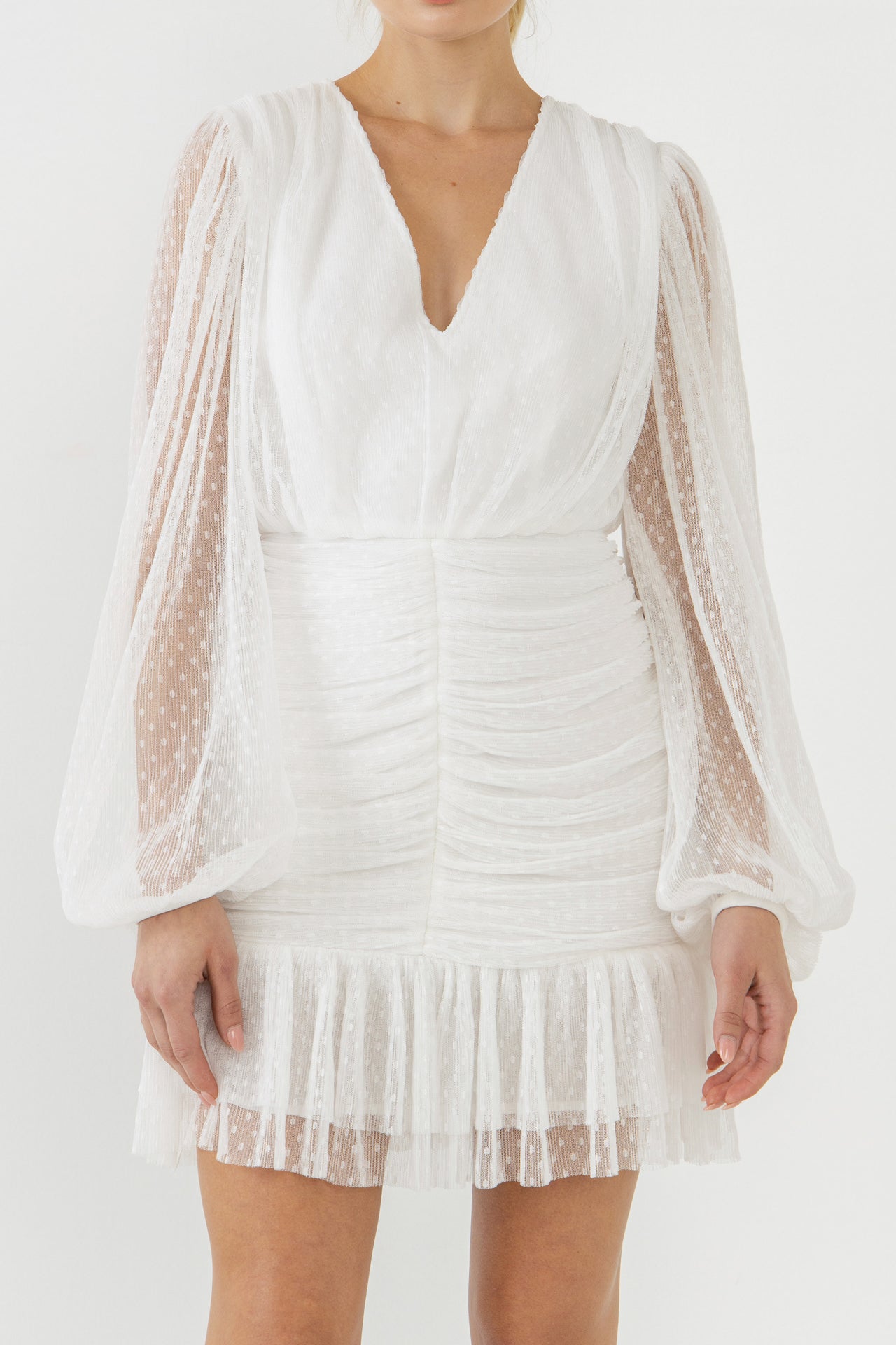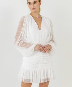 This breathtaking dress is perfect for any woman who wants to feel confident and fabulous. The Swiss dot mesh overlay is adorned with delicate long sleeves, ruched lower bodice, and a V neckline. The back zipper and lining make it easy to slip on and off, and the ruching in the lower bodice is figure-flattering. Whether you’re attending a wedding or a black-tie event, this dress is sure to make you feel like the belle of the ball.
