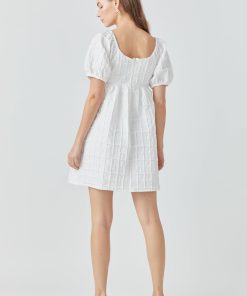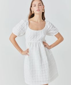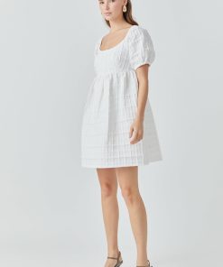 A baby doll mini dress created with textured fabric that features puffy sleeves and a flattering scoop neckline. It’s lined for comfortable all-day wear and has hidden pockets.
