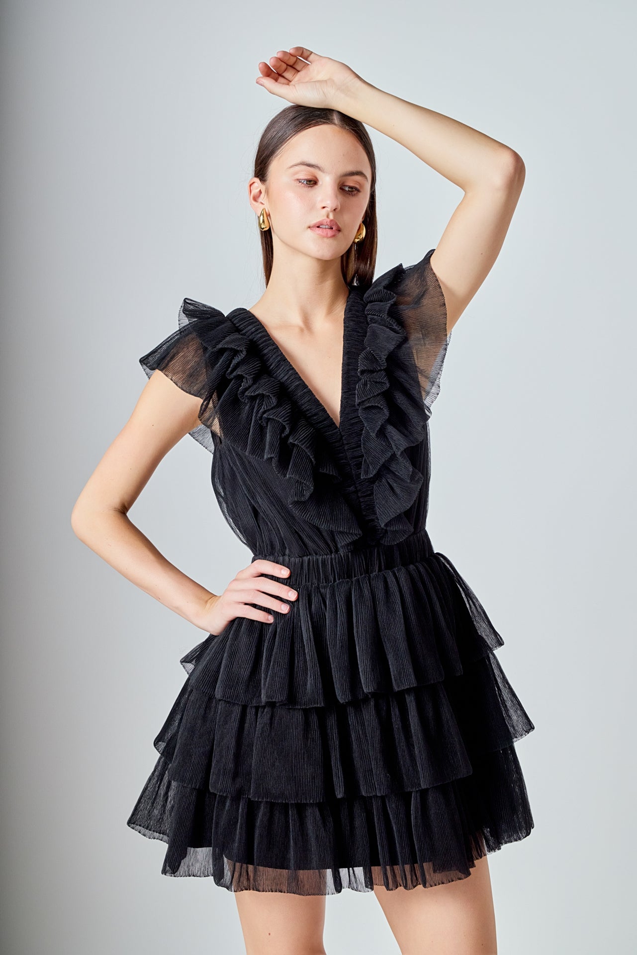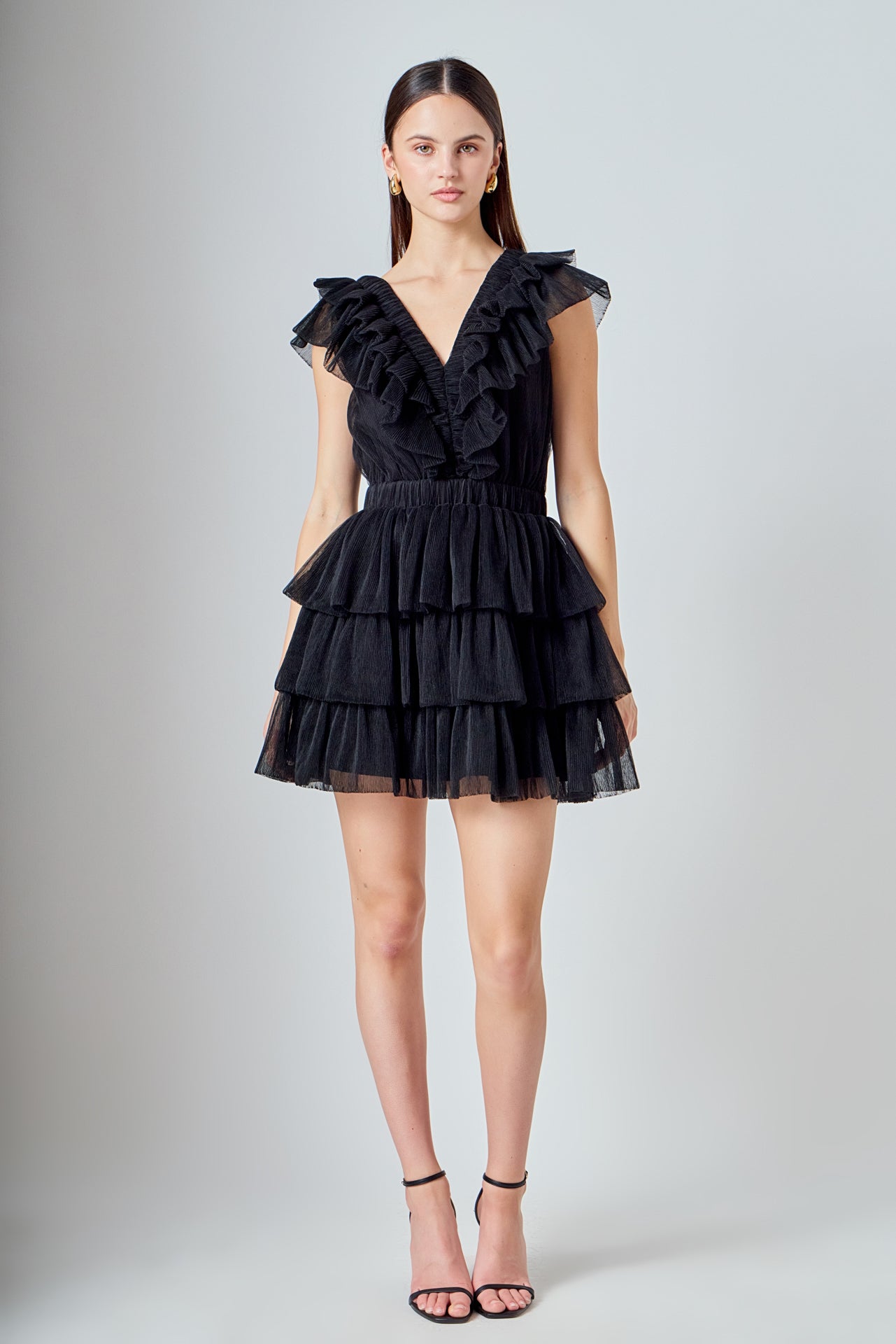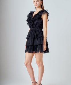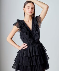 This elegant Tulle Ruffle Tiered Mini Dress is perfect for special occasions. It features a flattering front V neckline and a square neckline at the back complete with romantic ruffle detailing throughout. The tiered skirt adds a touch of feminine charm making this dress a must-have for your wardrobe. It’s a timeless piece that’s sure to turn heads at any event.