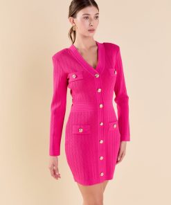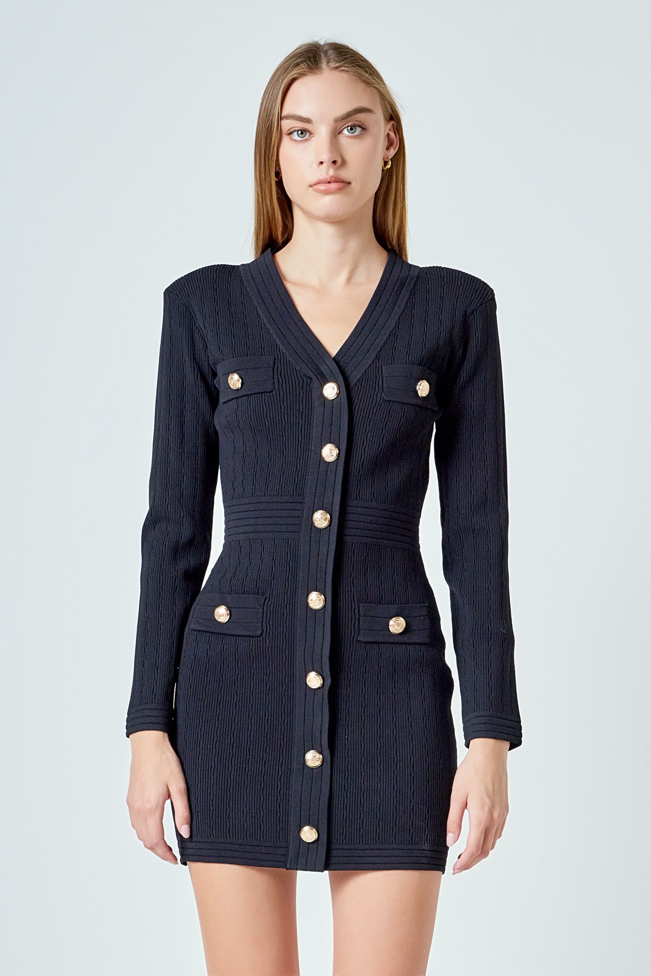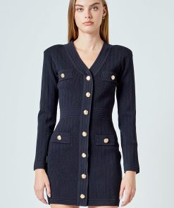 This V-neck Long Sleeve Knit Mini Dress is a stylish and sophisticated way to stay on trend for any occasion. Featuring a V neckline long sleeves with shoulder pads and a front unfunctional placket with shank buttons this dress is perfect for any occasion. It offers a flattering fit and effortless elegance and is sure to boost your wardrobe rotation. With its unique features and modern style this dress will be sure to elevate your look.