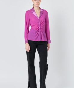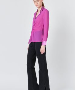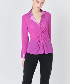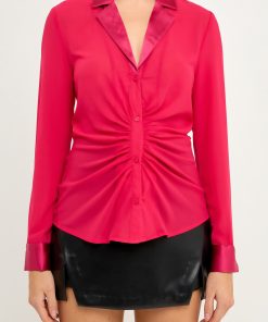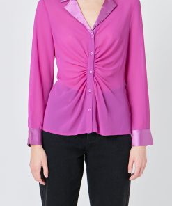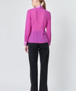 The mixed media chiffon blouse is a must have in every fashionista’s wardrobe. This blouse is perfect for dressing up or dressing down. With a cinched waist detail, collar and lapel, and front buttons, this top can go from day to night in an instant. Pair it with your favorite jeans or trousers for a timeless look.