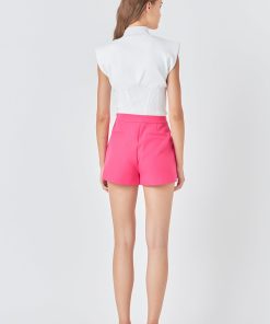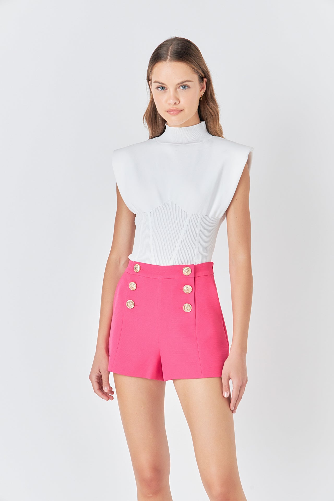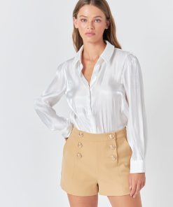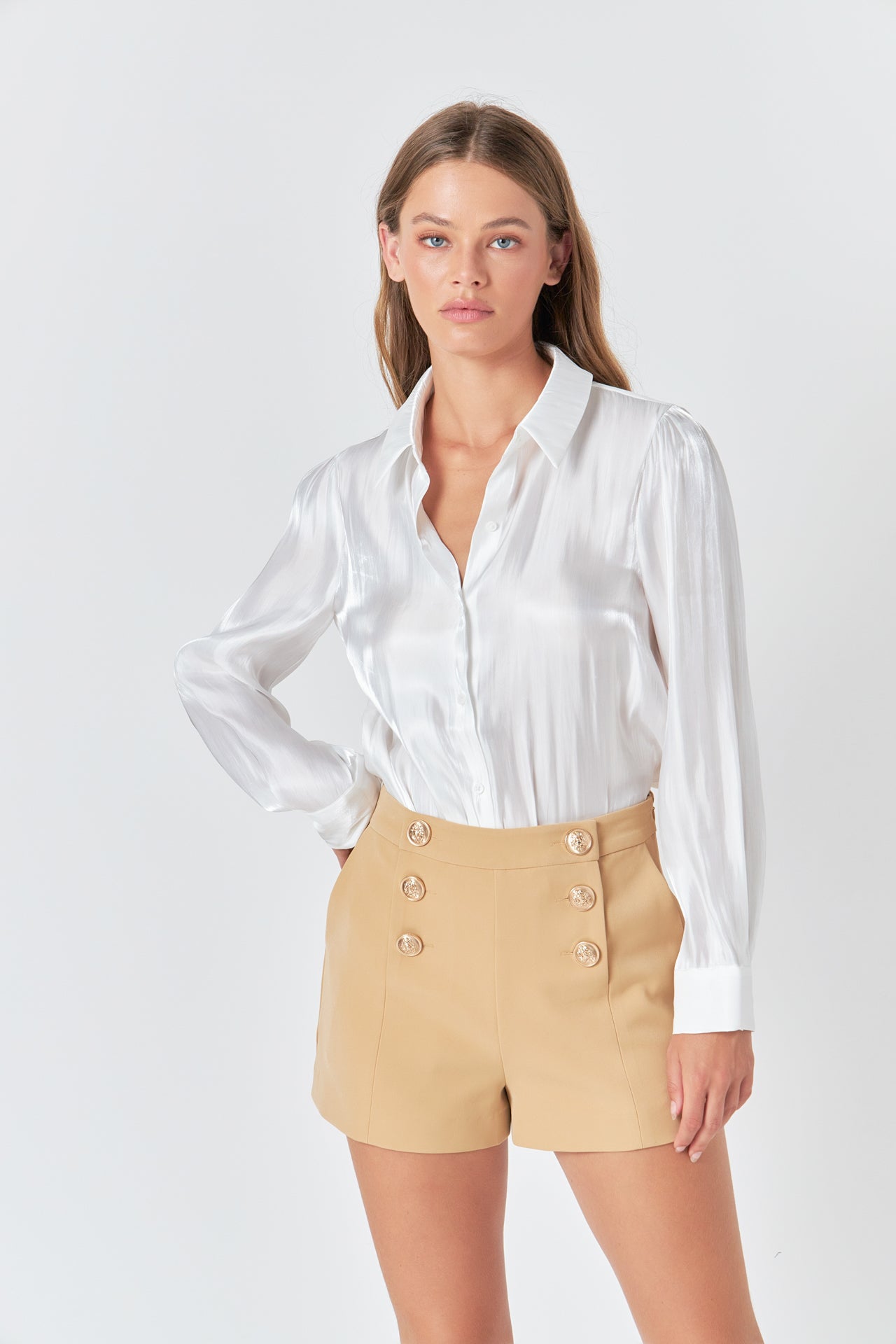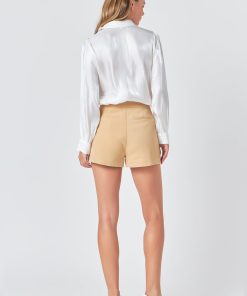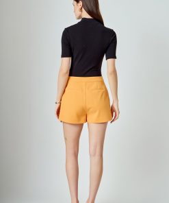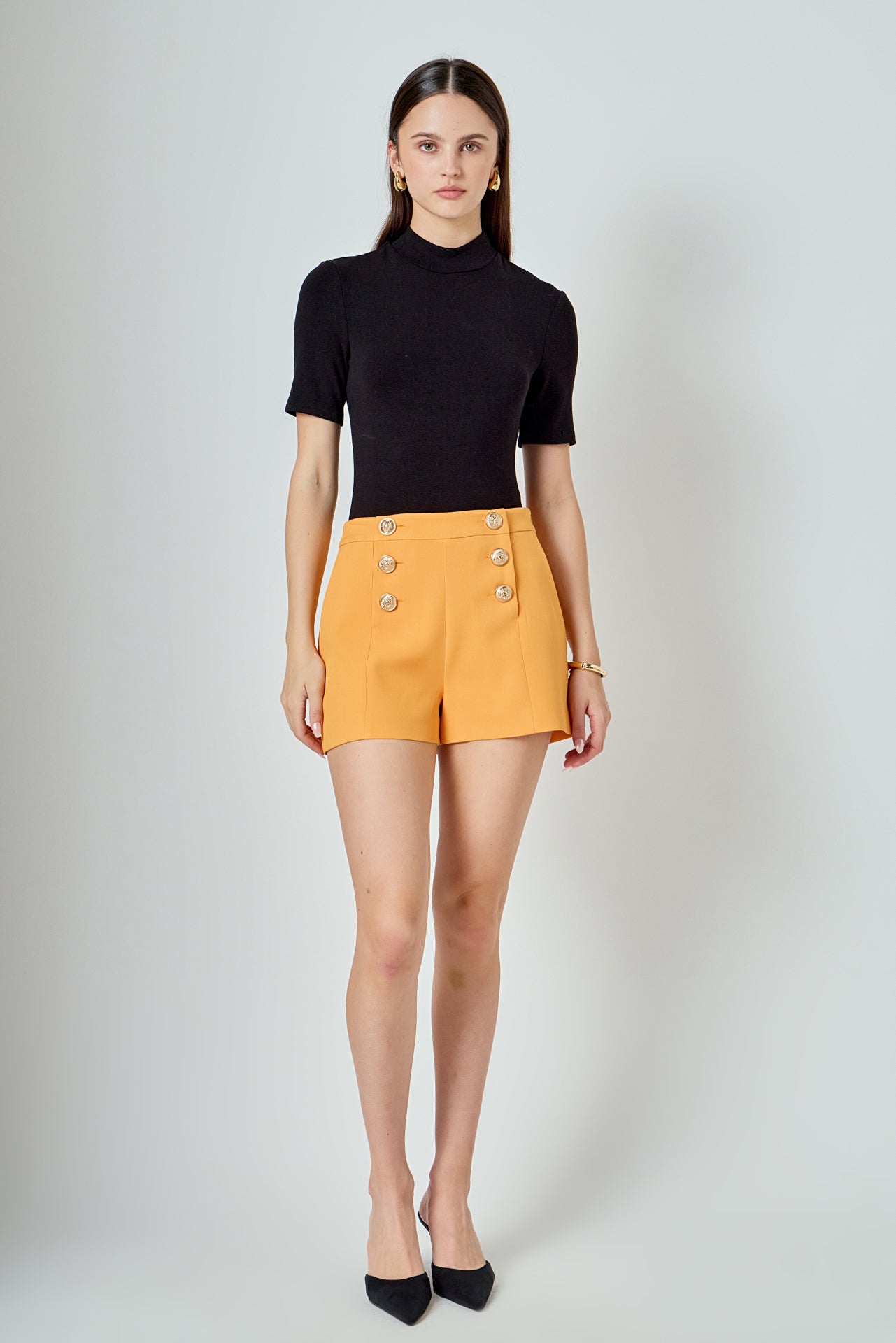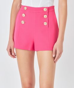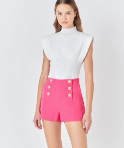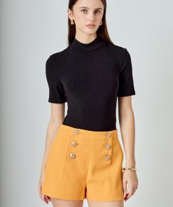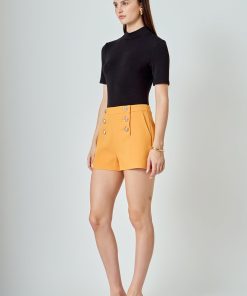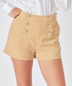These shorts are sure to turn heads with their sleek gold button detail. With a high waist and invisible zipper, these shorts provide a flattering and comfortable fit. Made from luxurious fabric, they’re perfect for dressing up or down. Wear these shorts to your next special event or just when you want to feel glamorous.