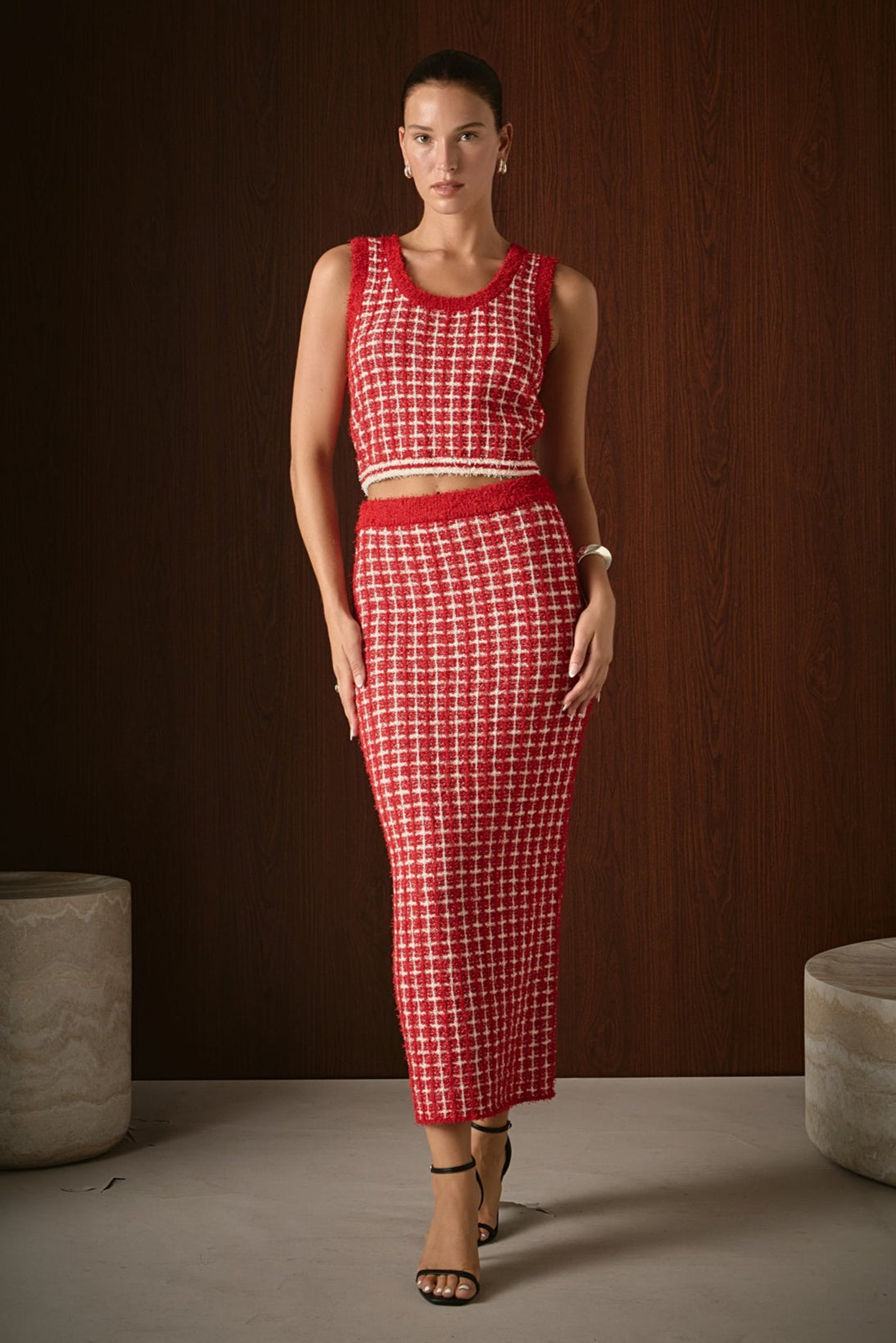 Elevate your wardrobe with our must-have Knit Crop Top. Made from a soft knit fabric, this top is both comfortable and stylish. The check print adds a touch of trendiness, while the fitted design flatters your figure. Perfect for any occasion, this crop top is both versatile and eye-catching. Pair it with high-waisted jeans for a chic look, or dress it up with a skirt for a night out. With its unique combination of style and comfort, this knit crop top is a must-have for every fashion-forward woman. Shop now and stand out from the crowd!