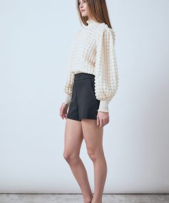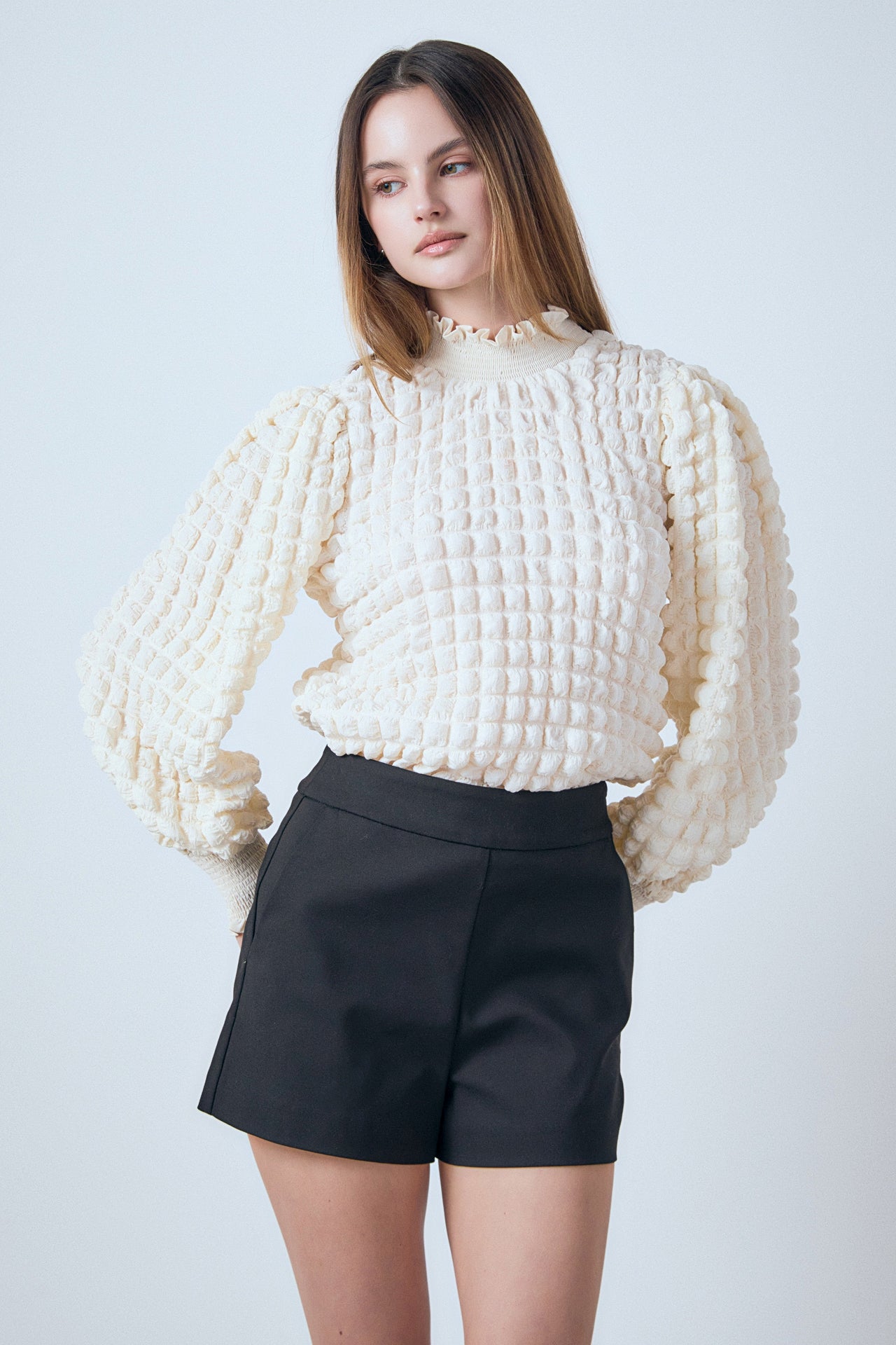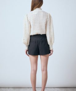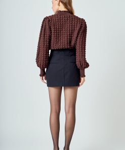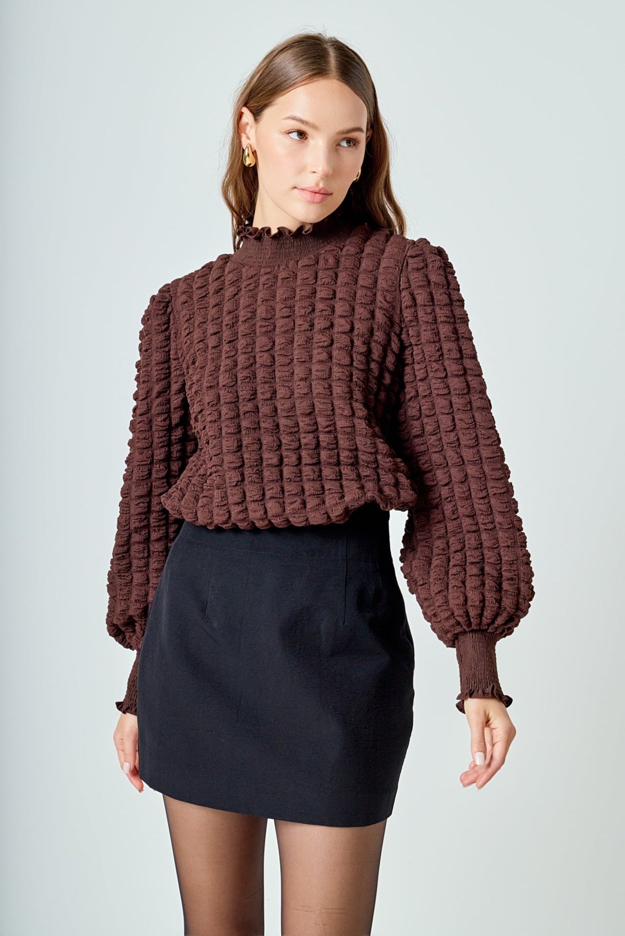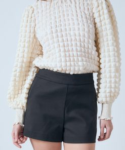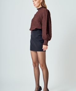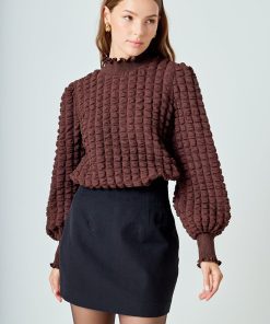 An elegant blouse that you can wear to work and then to date night. The unique textured fabric will catch your eye with this piece. You’ll also admire the blouson sleeves and mock neck that create a graceful style. Pair this mock neck top with trousers for work and then tuck it into a mini skirt for date night.