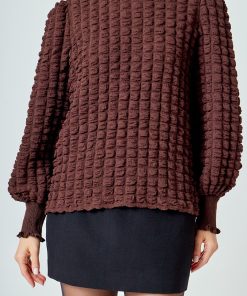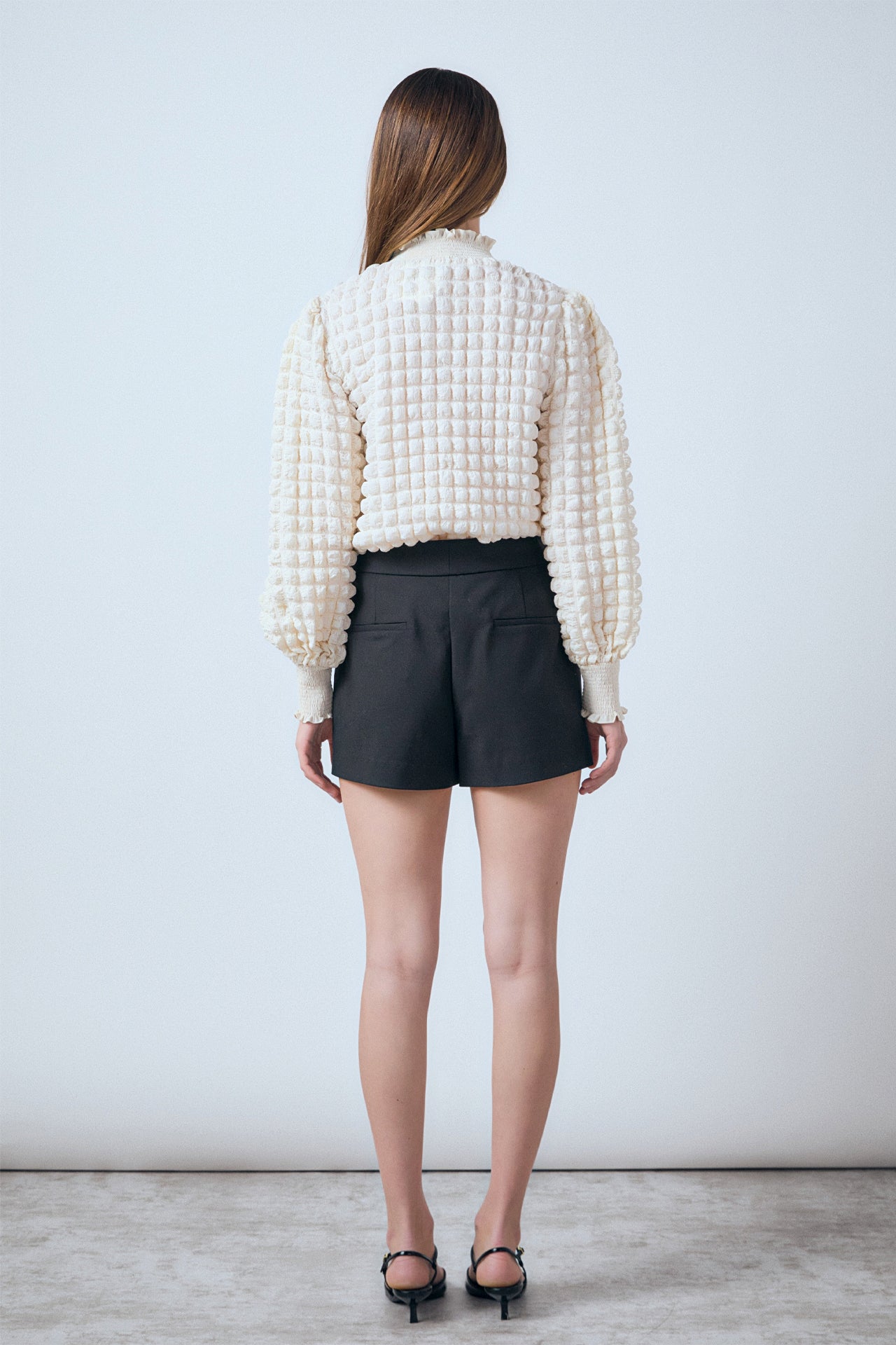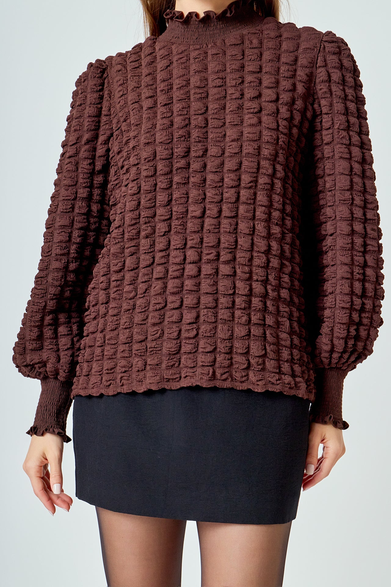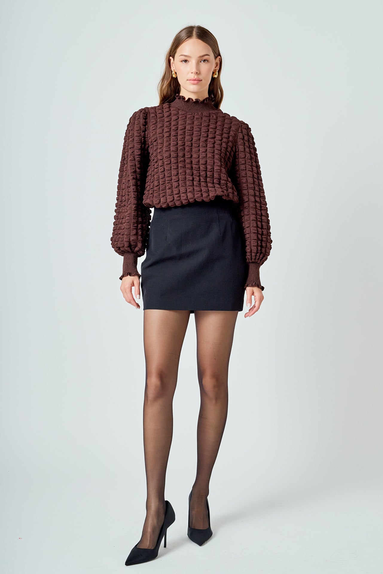 An elegant blouse that you can wear to work and then to date night. The unique textured fabric will catch your eye with this piece. You’ll also admire the blouson sleeves and mock neck that create a graceful style. Pair this mock neck top with trousers for work and then tuck it into a mini skirt for date night.