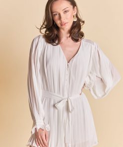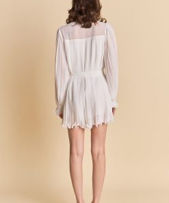 This stunning pleated romper is perfect for a day out in the sun or a night out on the town. Features include a button-up detail a v-neckline pleats and banded sleeves for a look that is chic and timeless. Perfect for introducing a little elegance to your look this unique romper is sure to drive sales. Stand out in this eye-catching statement piece.