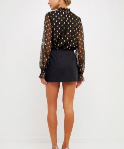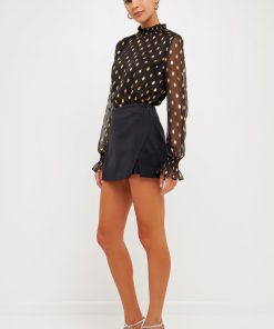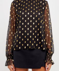 This elegant chiffon blouse features a metallic polka dot print. With feminine touches like ruffled sleeve hems and a back keyhole detail, it’s the perfect blouse to dress up any look with ease. Tuck this blouse into your favorite jeans, high-waisted pants, or skirt, and you’ll instantly create a chic, sophisticated look.