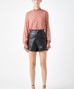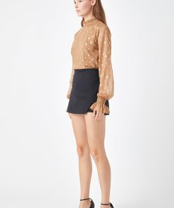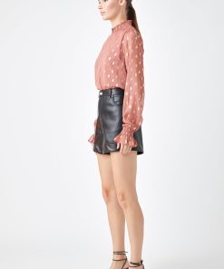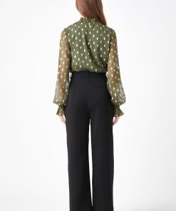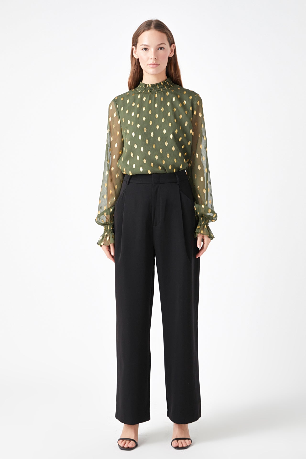 This elegant chiffon blouse features a metallic polka dot print. With feminine touches like ruffled sleeve hems and a back keyhole detail, it’s the perfect blouse to dress up any look with ease. Tuck this blouse into your favorite jeans, high-waisted pants, or skirt, and you’ll instantly create a chic, sophisticated look.