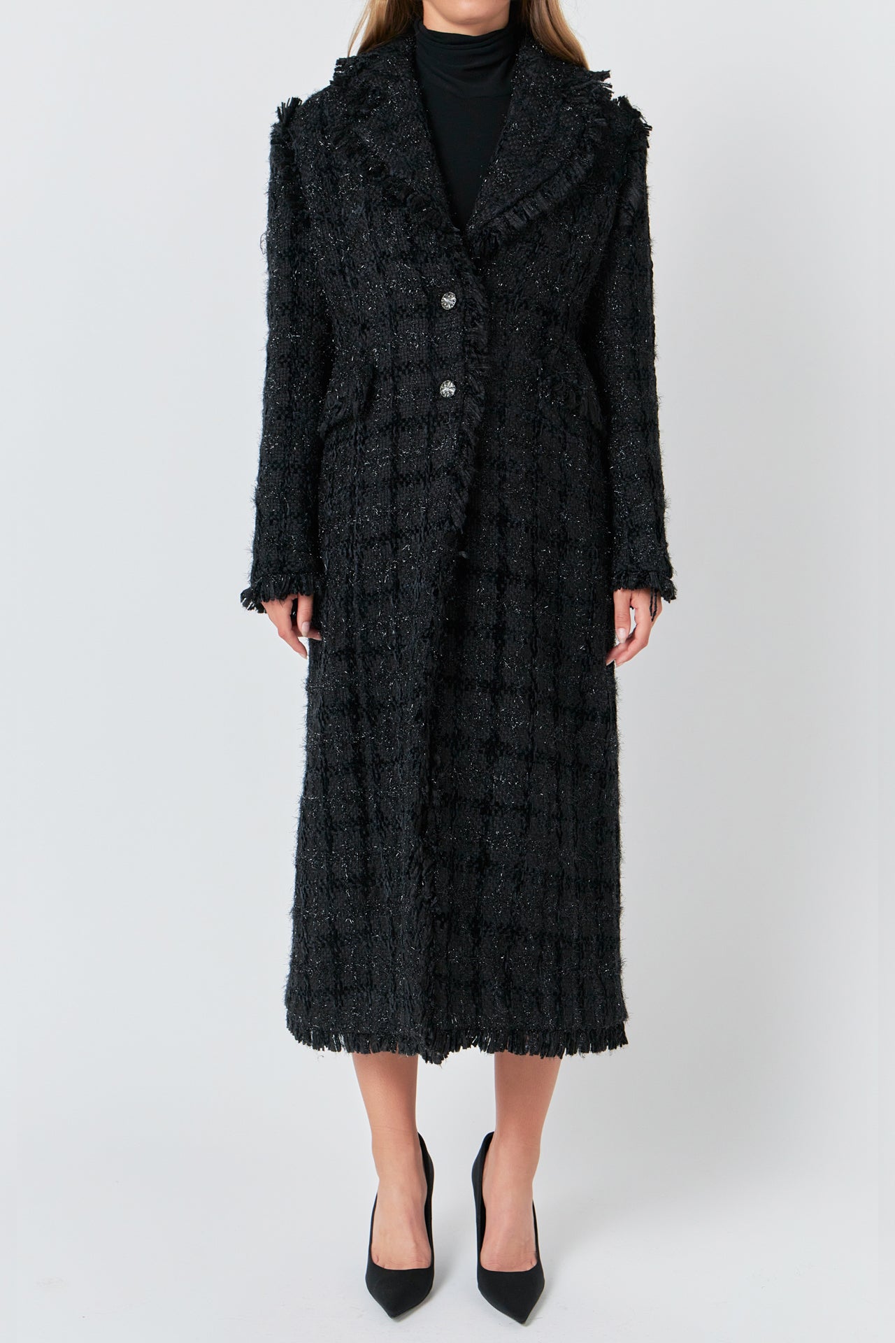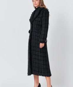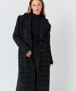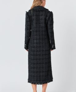 This luxurious tweed coat has lined pockets, jeweled buttons, and fringed edges. It’s finished with a large lapel collar.