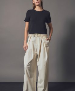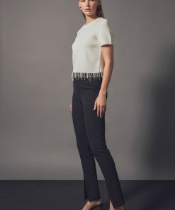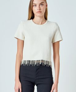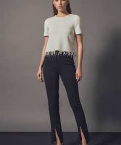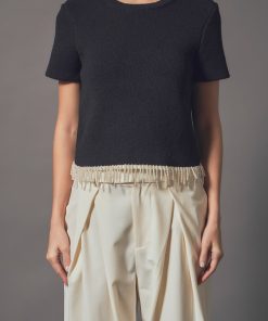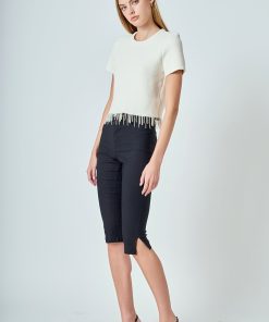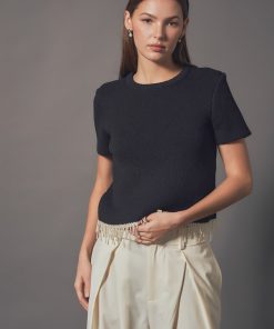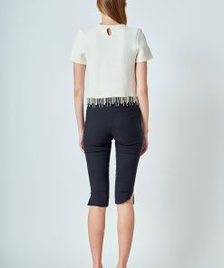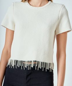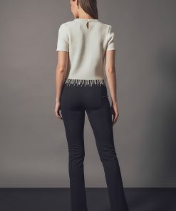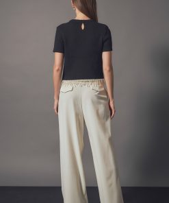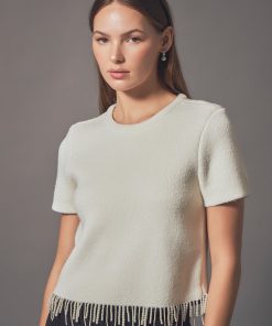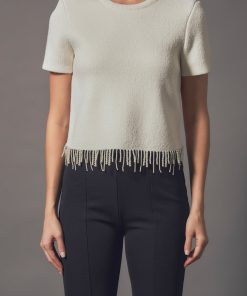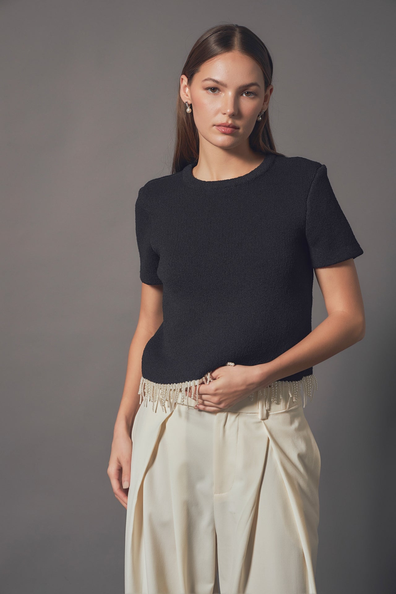 Elevate your everyday style with our Pearl Trim Knit Top, a perfect blend of comfort and sophistication. Crafted from a soft, breathable fabric, this versatile top keeps you feeling cozy while maintaining a polished look. The classic round neckline, short sleeves, and delicate pearl trim details add a refined touch, while the back keyhole button closure lends a graceful, feminine finish. Designed to flatter with its timeless silhouette, this piece is ideal for both casual days and more elevated occasions. Make a subtle yet refreshing style statement every time you wear it.