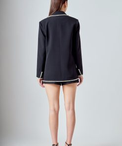 Step up your style game with this elegant Premium Pearl-Trimmed Blazer. Crafted with a classic oversized look and two button closure this chic blazer features long sleeves with pearl trim edges shoulder pads and a notched collar for an eye-catching look. It is fully lined to provide you a comfortable feel.