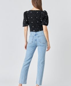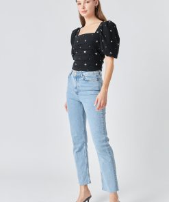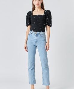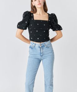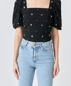 This elegant Sequins Floral Embroidery Top is crafted with exquisite detail. Featuring a square neck for a modern take on the classic look short puff sleeves center back conceal zipper closure and stunning sequin floral embroidery this top will turn heads.