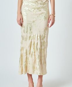 Make a bold impression with our Printed Foil Maxi Skirt a standout piece designed to turn heads. Featuring a striking all-over print and a shimmering foil finish, this skirt brings effortless glamour to any look. The elegant maxi length is enhanced by a subtle center back slit for added movement and a touch of sophistication, while the full lining ensures all-day comfort and confident wear. Whether you’re dressing it down for a casual outing or elevating it for a special event, this versatile skirt is your go-to for effortless style. Perfect for fashion lovers ready to embrace a statement-making look. Add this must-have piece to your collection today!