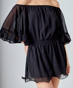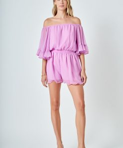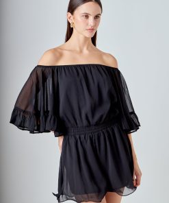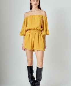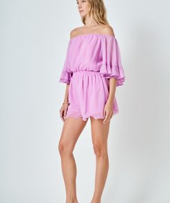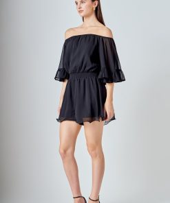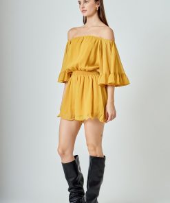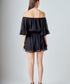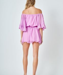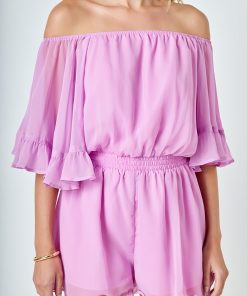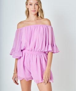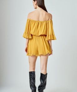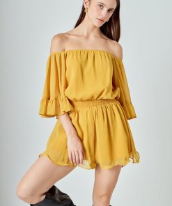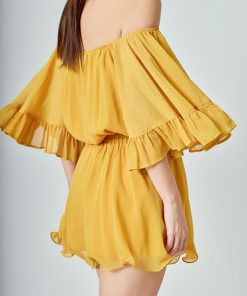 This ruffled sleeve romper is perfect for a day of fun in the sun. The off-the-shoulder silhouette and ruffle sleeves add a touch of femininity to this casual piece. The elastic at the waist ensures a comfortable and flattering fit. Made from a solid chiffon fabrication this romper is sure to become your new go-to piece for any casual occasion.