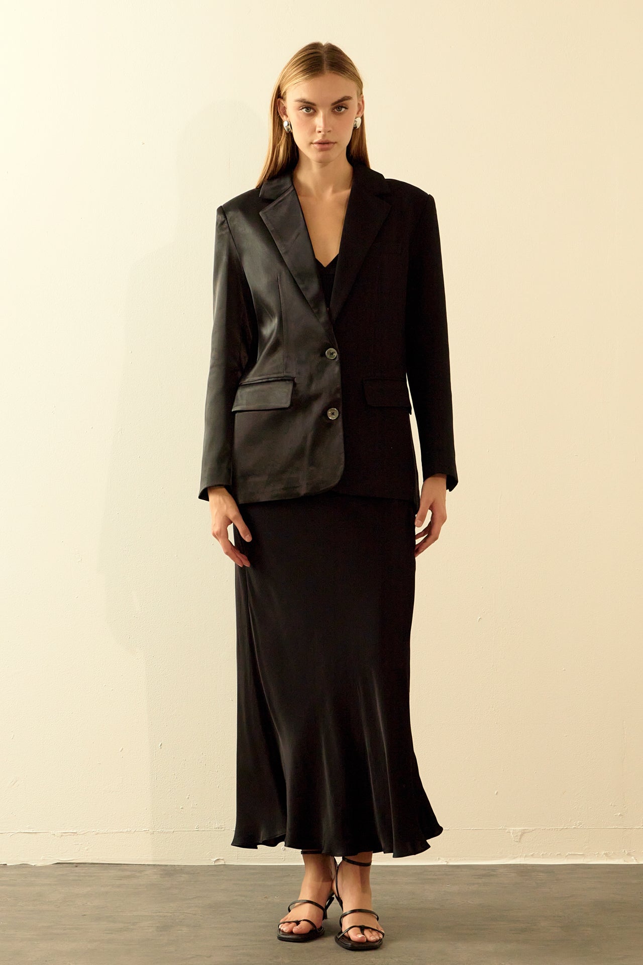 Our Satin Suit Blazer offers a unique blend of style and function perfect for any occasion. The mixed fabric composition gives it a subtle texture that sets it apart from your everyday blazer. Its slightly oversized design is flattering to all body shapes and creates an instant slimming effect. Its flap pockets add extra detail and functionality while the satin combo brings the blazer to life giving it an elevated feel. Ideal for any occasion this blazer will add that special touch to any look.