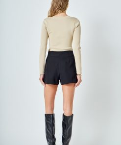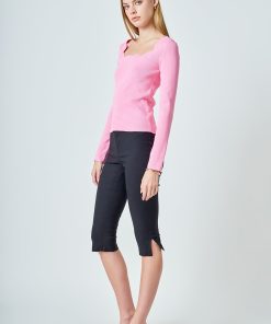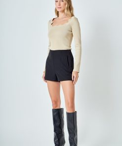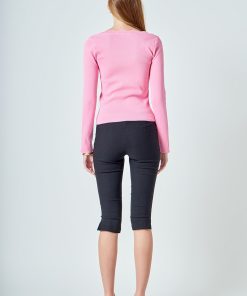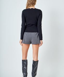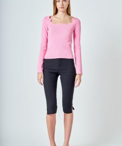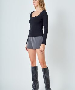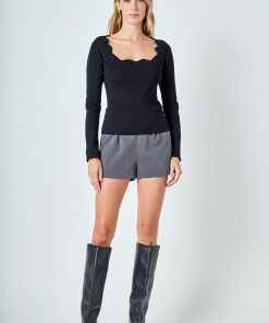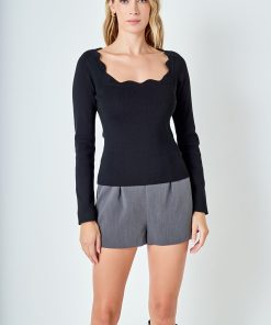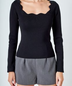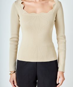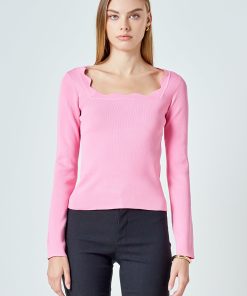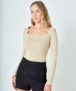 This Scallop Detail Long Sleeve Sweater is a chic and unique piece for any wardrobe. The piece features a square neckline with scallop edge detailing, long sleeves, and a fitted knit top. Perfect for making a statement and staying warm and cozy in any weather.