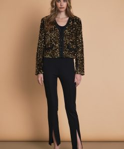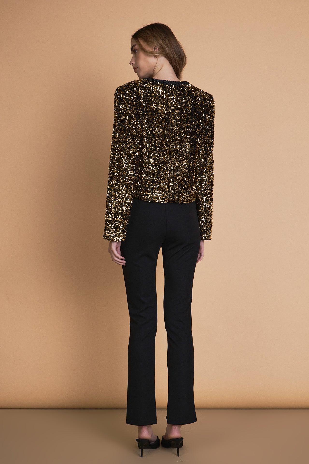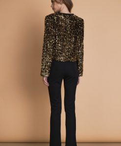 Sparkle up your wardrobe with our stunning Sequin Jacket! This eye-catching jacket features dazzling sequins, adding a touch of glamour to any outfit. With elevated shoulder pads and long sleeves, it adds structure and sophistication. The tape trim details along the edges add a touch of modernity to this classic piece. Perfect for any occasion, our Sequin Jacket is a must-have for your wardrobe. Shine bright and stand out from the crowd with this statement piece.