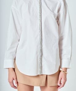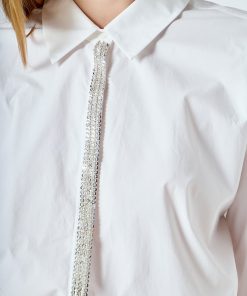 Crafted from airy, lightweight cotton, this button-up shirt offers a perfect balance of comfort and polish. Designed with a slightly oversized fit, it drapes effortlessly on the body for a relaxed yet refined silhouette. The standout detail is the placket, intricately adorned with shimmering sequins and delicate beadwork, adding a subtle touch of glamour to this classic piece. Easy to style and endlessly versatile, this shirt can be worn tucked into tailored trousers for an elevated look or left loose over denim for a chic, effortless vibe. A wardrobe essential with a sophisticated twist.