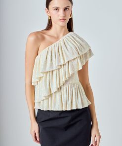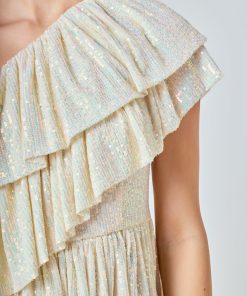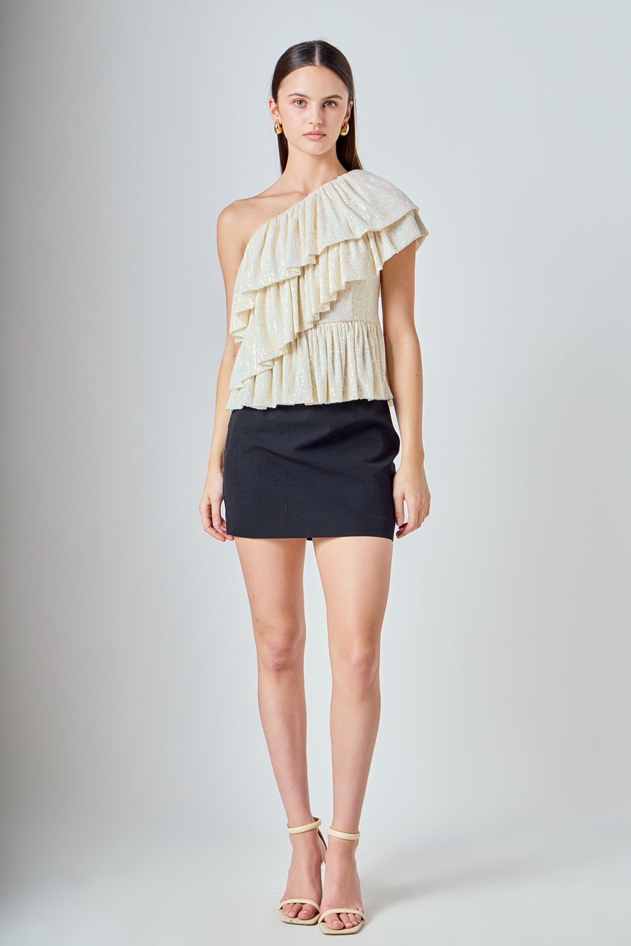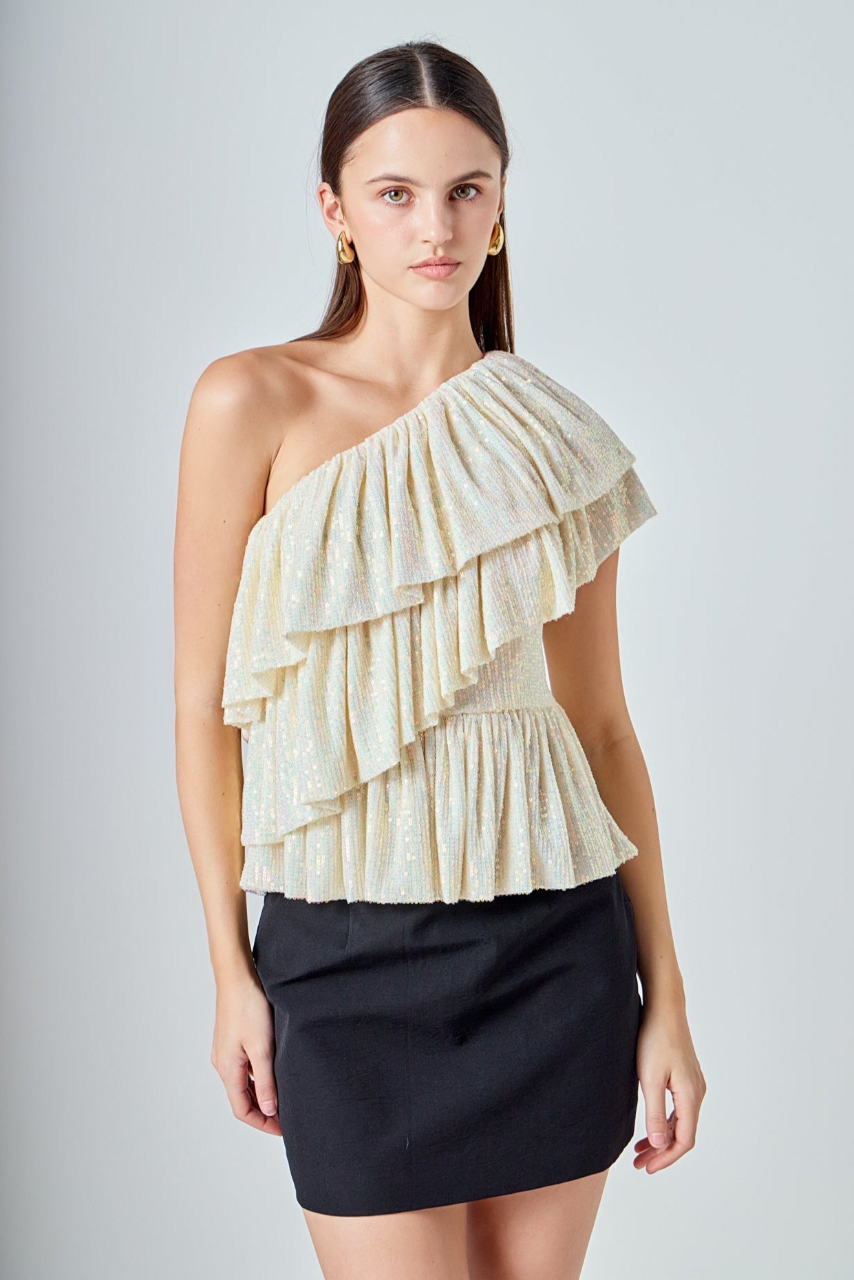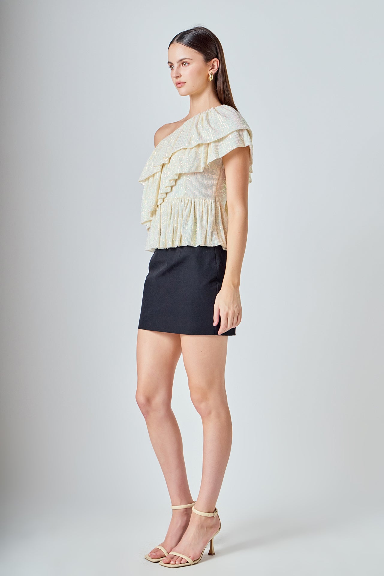 This stunning Sequins One Shoulder Ruffle Top is the perfect addition to your wardrobe. Showstopping sequins cover the one-shoulder ruffle bodice creating a dazzling look that will make you stand out at any event. The side zipper closure ensures a comfortable fit with a perfect finish. This must-have top is perfect for dressing up any occasion and will soon become your favorite go-to. Get the look and elevate your wardrobe!