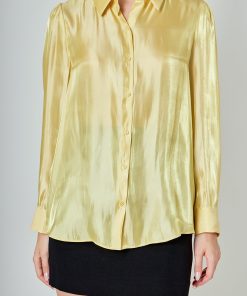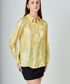 Classic shirt details like buttoned cuffs a curved hemline and center-front buttons make up this Shiny Dress Shirt. The iridescent slightly sheer fabric elevates this wardrobe staple.