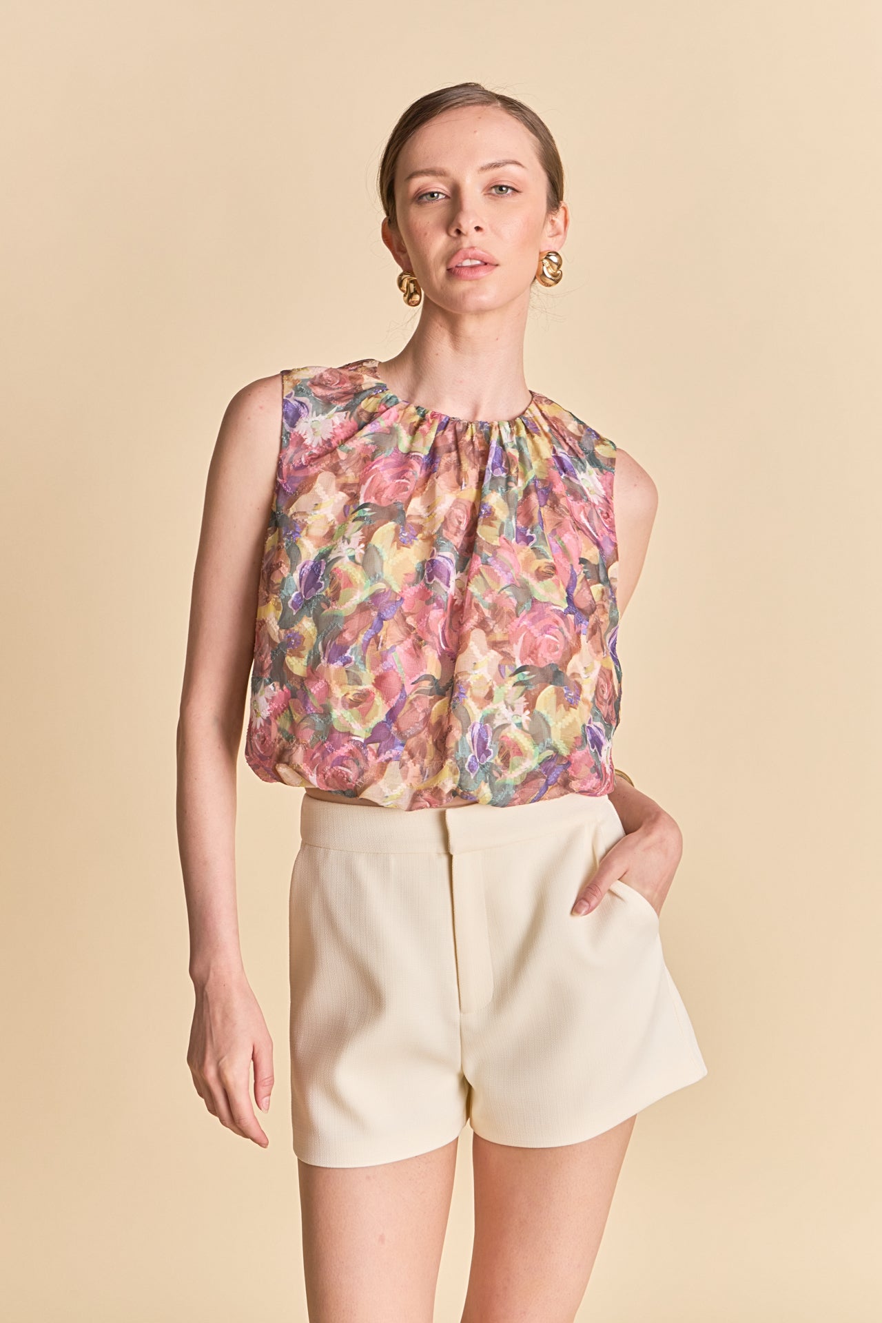Upgrade your wardrobe with our Floral Sleeveless Blouson Top! This top combines feminine florals with a sleek sleeveless design, making it perfect for any season. The blouson hem adds a trendy touch, while the round neck with shirring detail offers a flattering fit. Pair it with your favorite jeans and statement accessories for a chic look. Don’t miss out on this versatile and stylish addition to your collection. Get yours now and feel confident in this must-have piece! Shop our Floral Sleeveless Blouson Top for a fashionable and effortless ensemble.