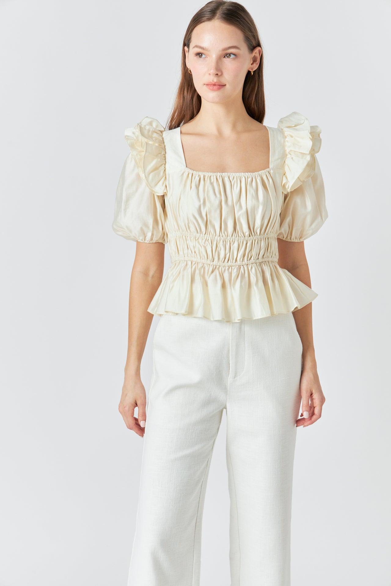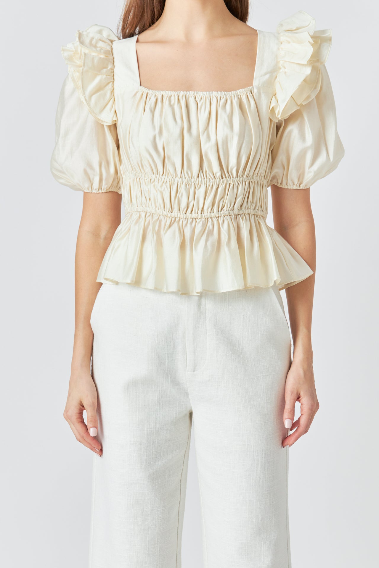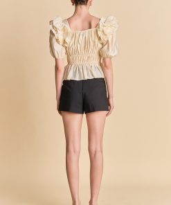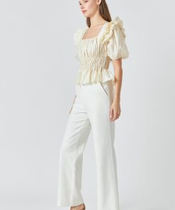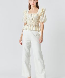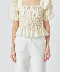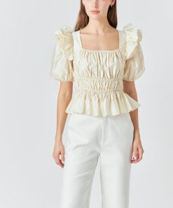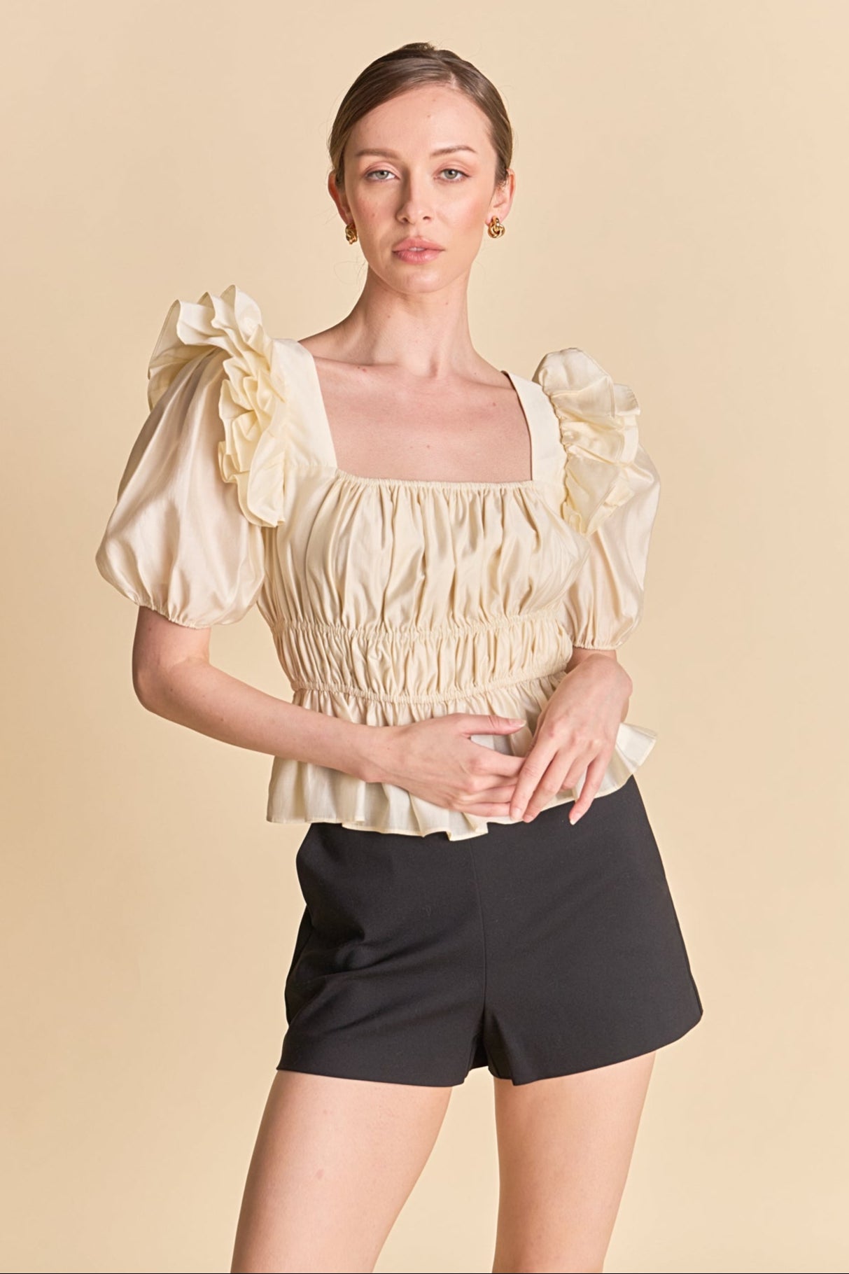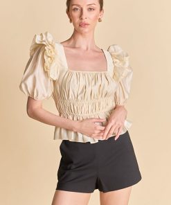 Our beautiful Smocked Puff Sleeve Top is the perfect piece to put on when you want to give your outfit a feminine flair. The puffy short sleeves are accentuated with dramatic ruffle detailing and a flattering square neckline. The smocked bodice forms to your body and flairs into a peplum silhouette
