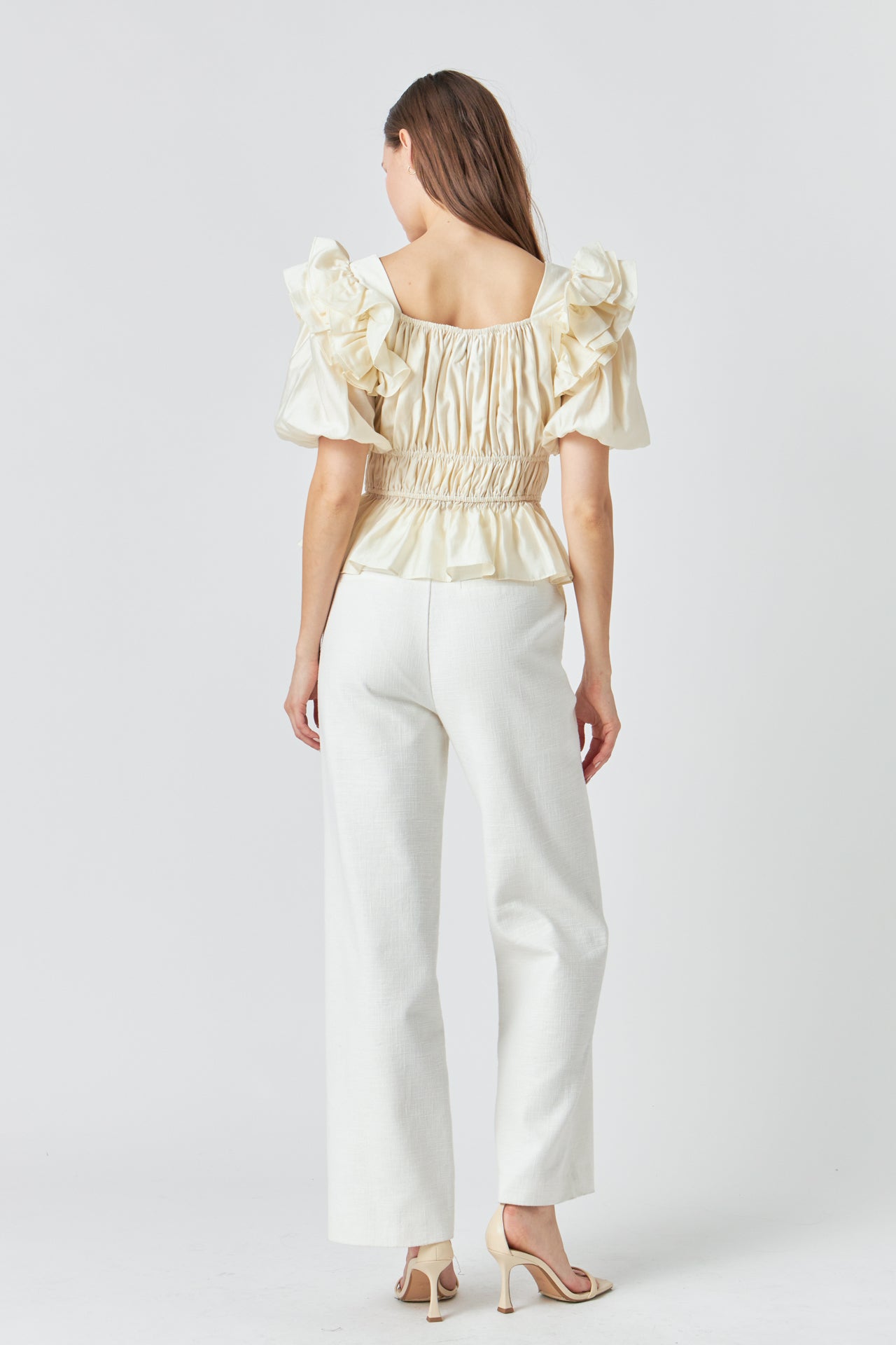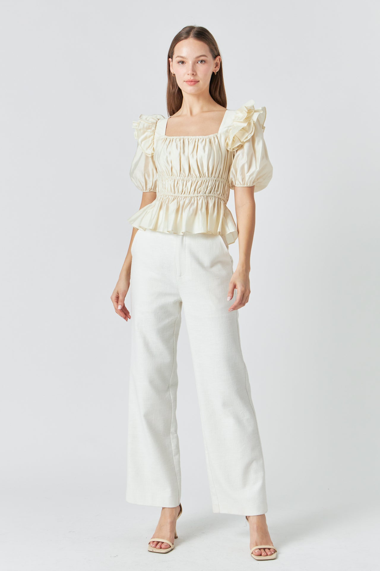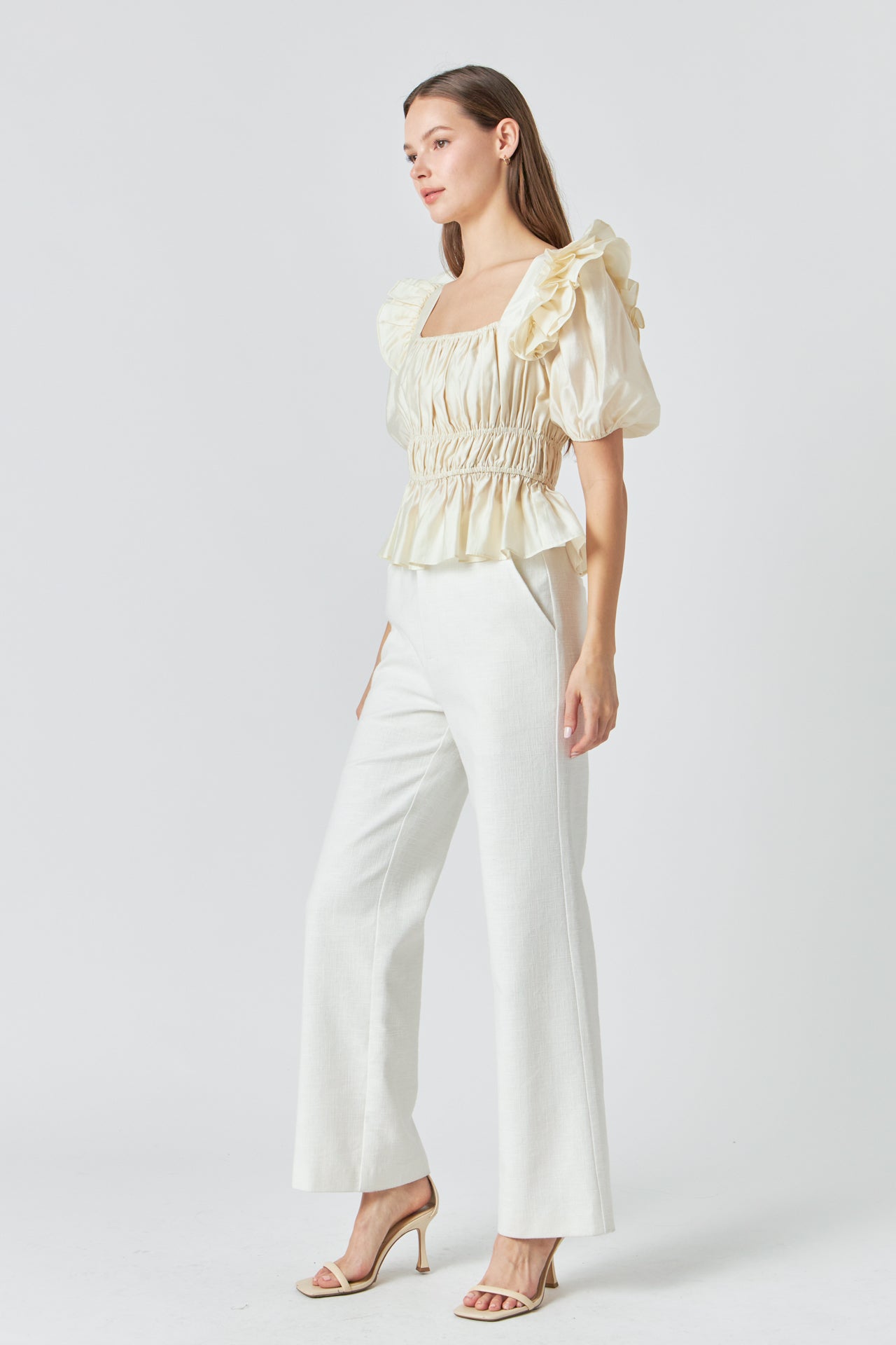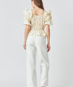 Our beautiful Smocked Puff Sleeve Top is the perfect piece to put on when you want to give your outfit a feminine flair. The puffy short sleeves are accentuated with dramatic ruffle detailing and a flattering square neckline. The smocked bodice forms to your body and flairs into a peplum silhouette