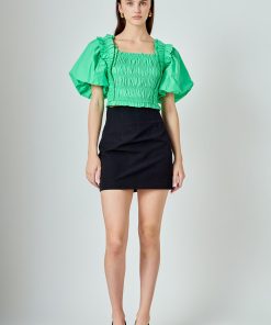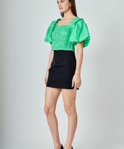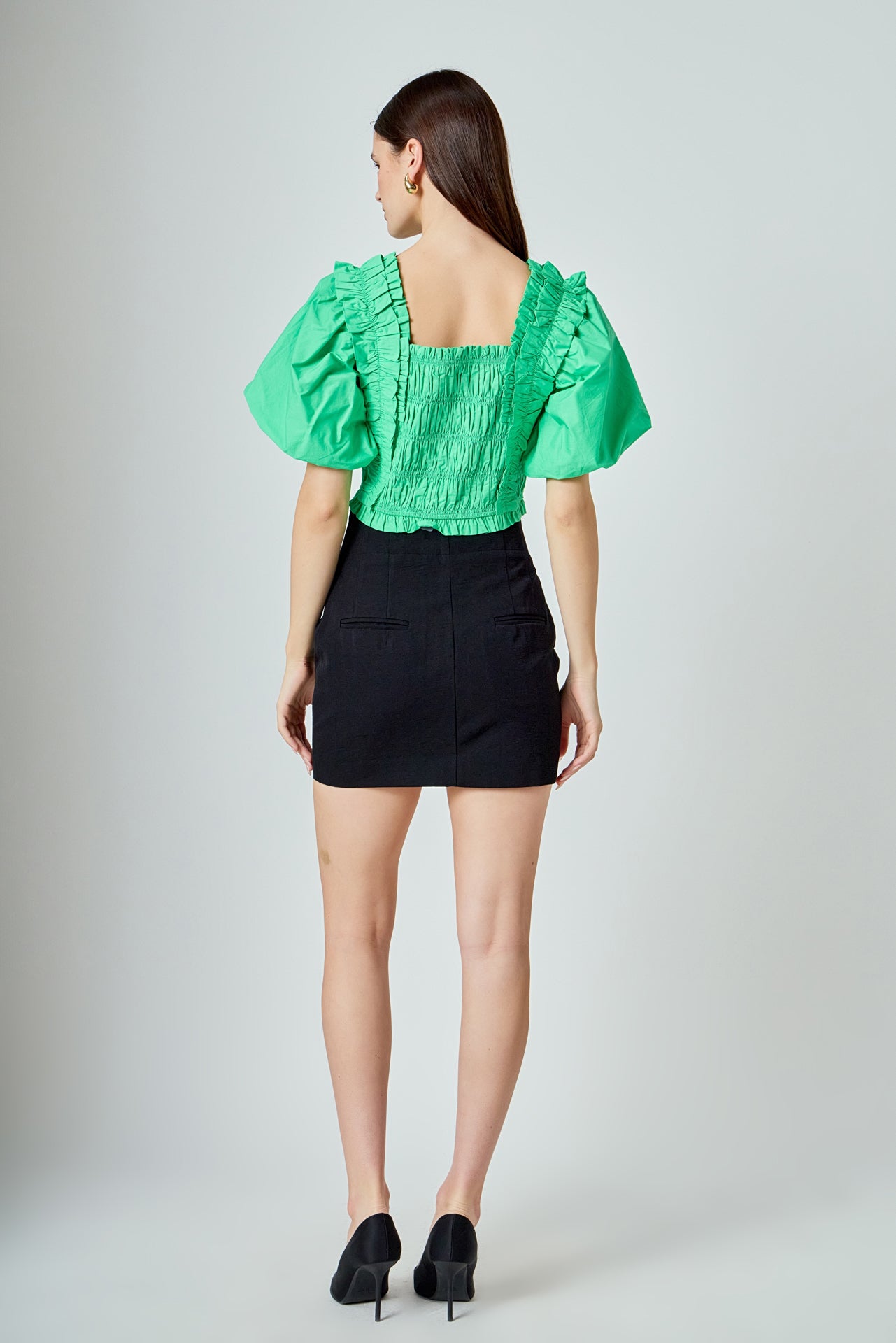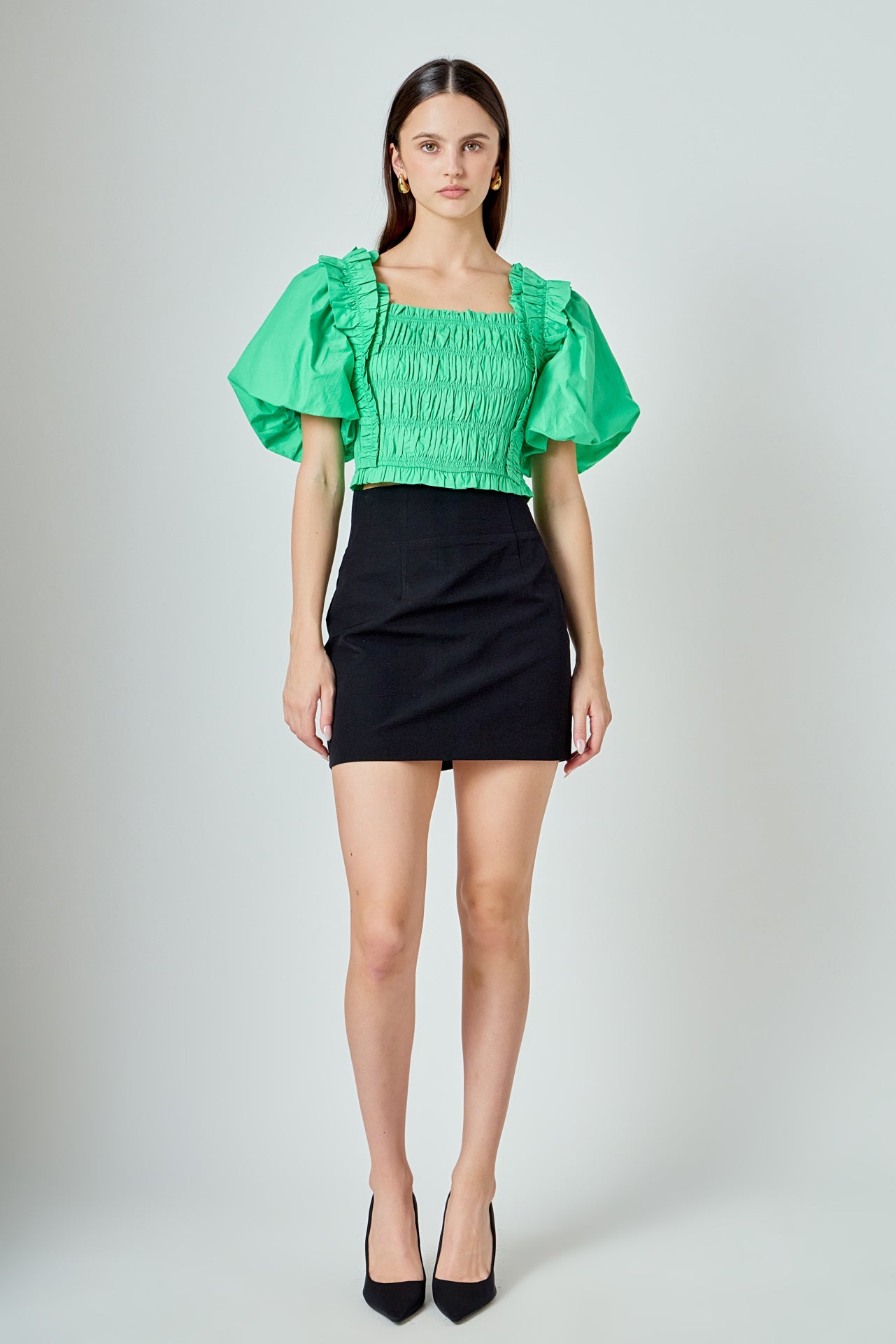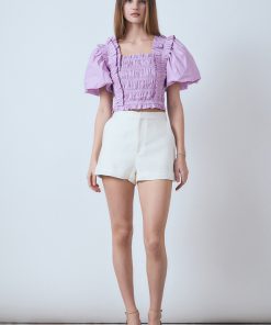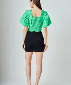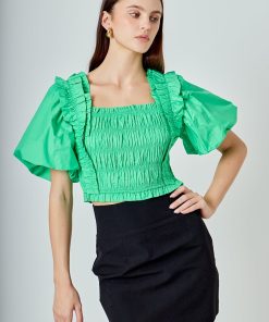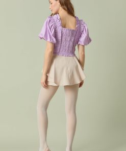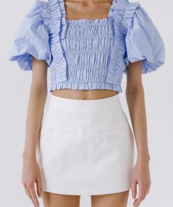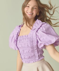 This top is perfect for those days when you want to feel cute and comfortable. The smocked bodice ensures a flattering fit while the folded ruffle detail adds a touch of personality. Plus the short puff sleeve provides just the right amount of coverage.