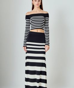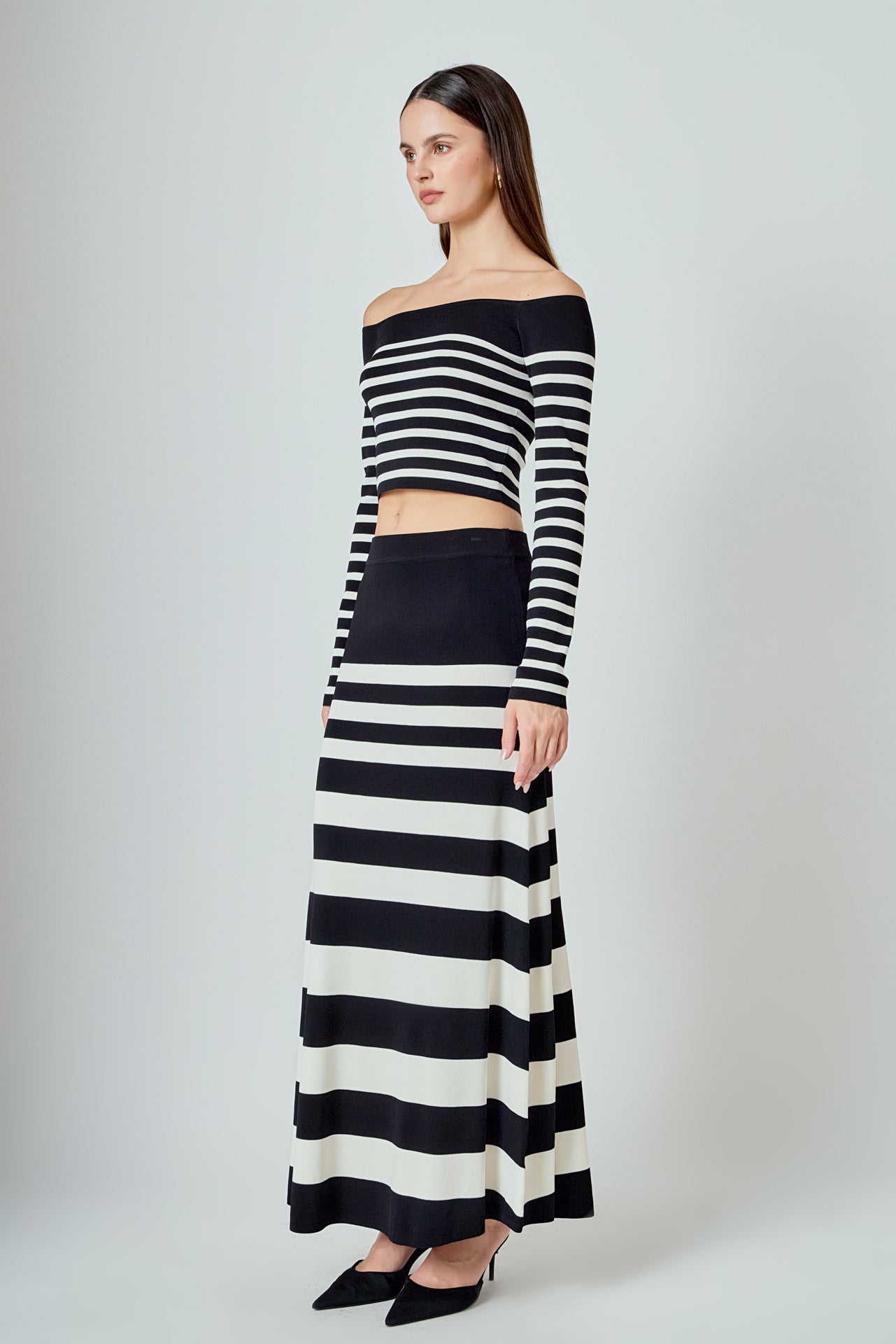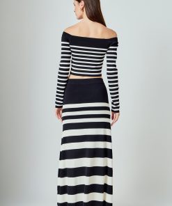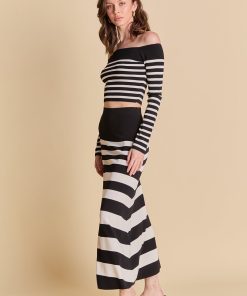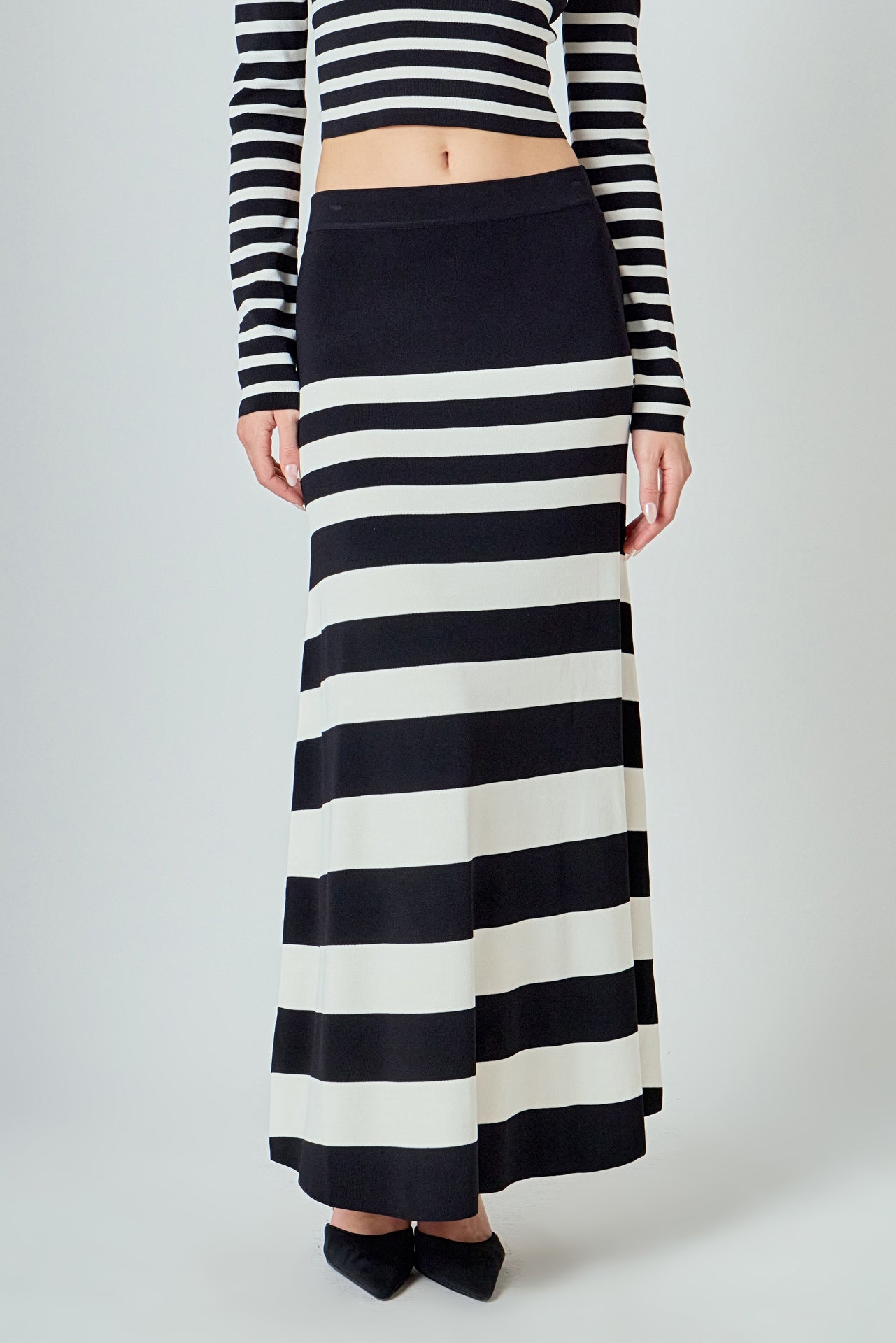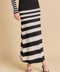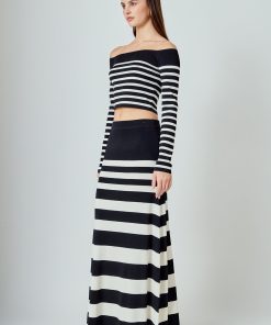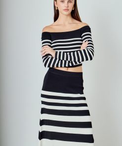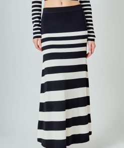 Step into style with our Striped Midi Skirt. The flattering fit and flare silhouette delivers comfort and definition, while the knit fabric offers a soft and lightweight feel. Its midi length adds a touch of sophistication, perfect for both casual and formal occasions. With classic stripes that add a timeless charm to your wardrobe, this skirt is versatile and easy to style. Shop now and make a fashion statement with ease.