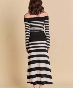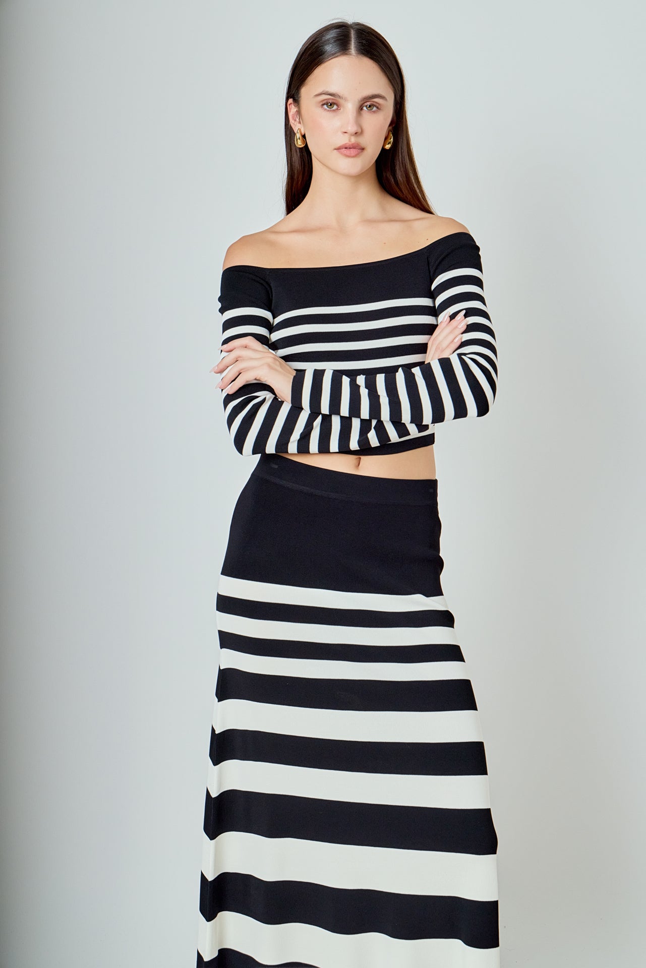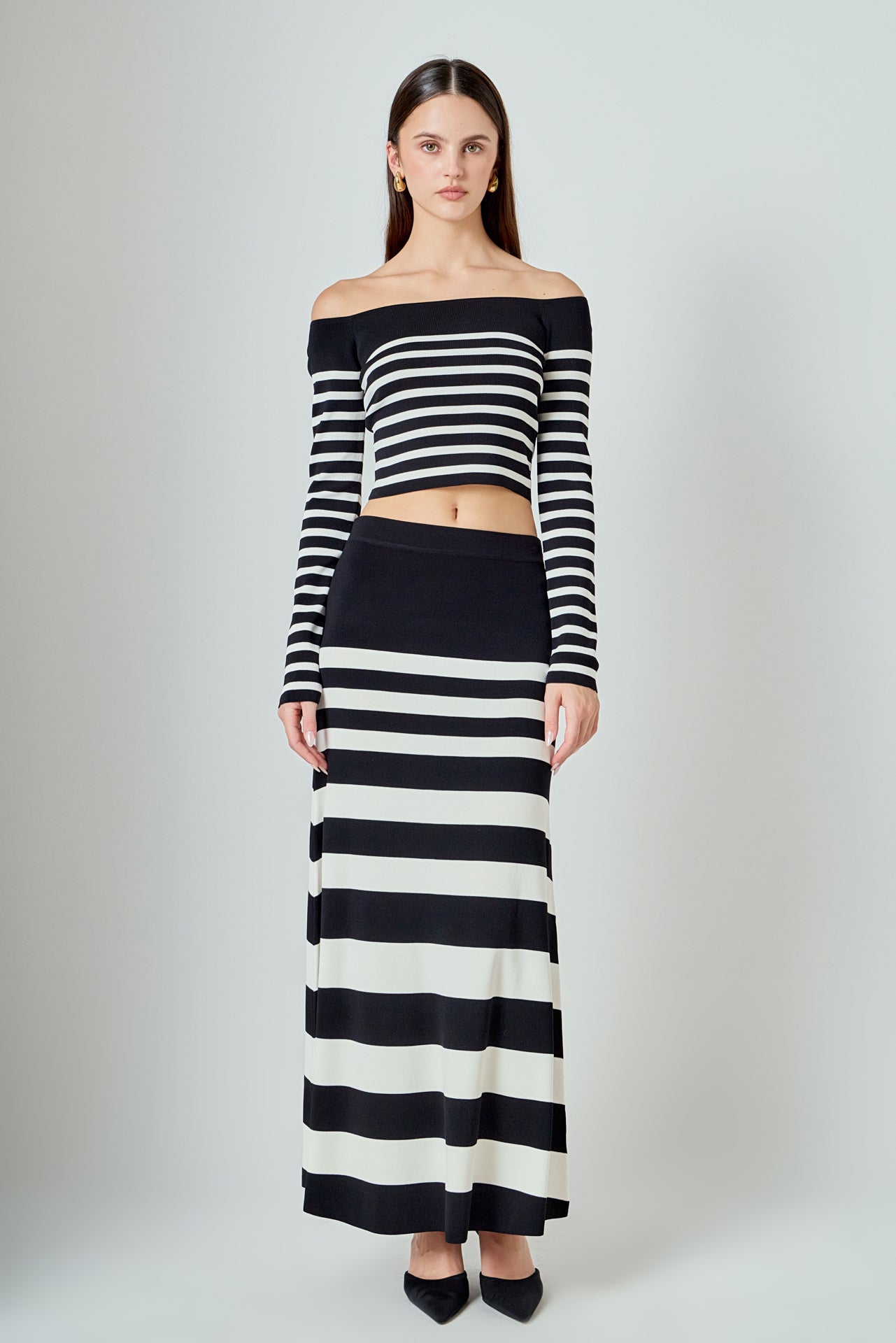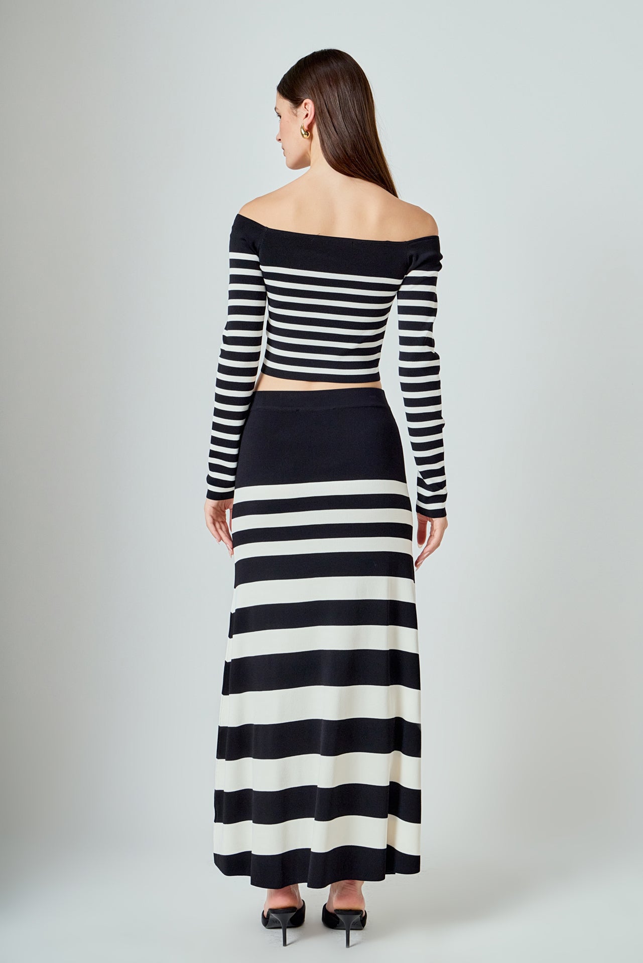 Step into style with our Striped Midi Skirt. The flattering fit and flare silhouette delivers comfort and definition, while the knit fabric offers a soft and lightweight feel. Its midi length adds a touch of sophistication, perfect for both casual and formal occasions. With classic stripes that add a timeless charm to your wardrobe, this skirt is versatile and easy to style. Shop now and make a fashion statement with ease.