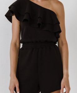 Introducing our Tiered Layer One Shoulder Romper, the epitome of elegance and style. Crafted with a tiered ruffle one-shoulder design, this romper exudes sophistication and grace. The side pockets offer convenience and functionality, while the elastic waist ensures a comfortable fit for all-day wear. Hand wash cold to maintain its pristine condition. Perfect for any occasion, this romper is a must-have addition to your wardrobe. Elevate your style and make a statement with our Tiered Layer One Shoulder Romper. Experience the allure of effortless beauty today.