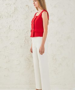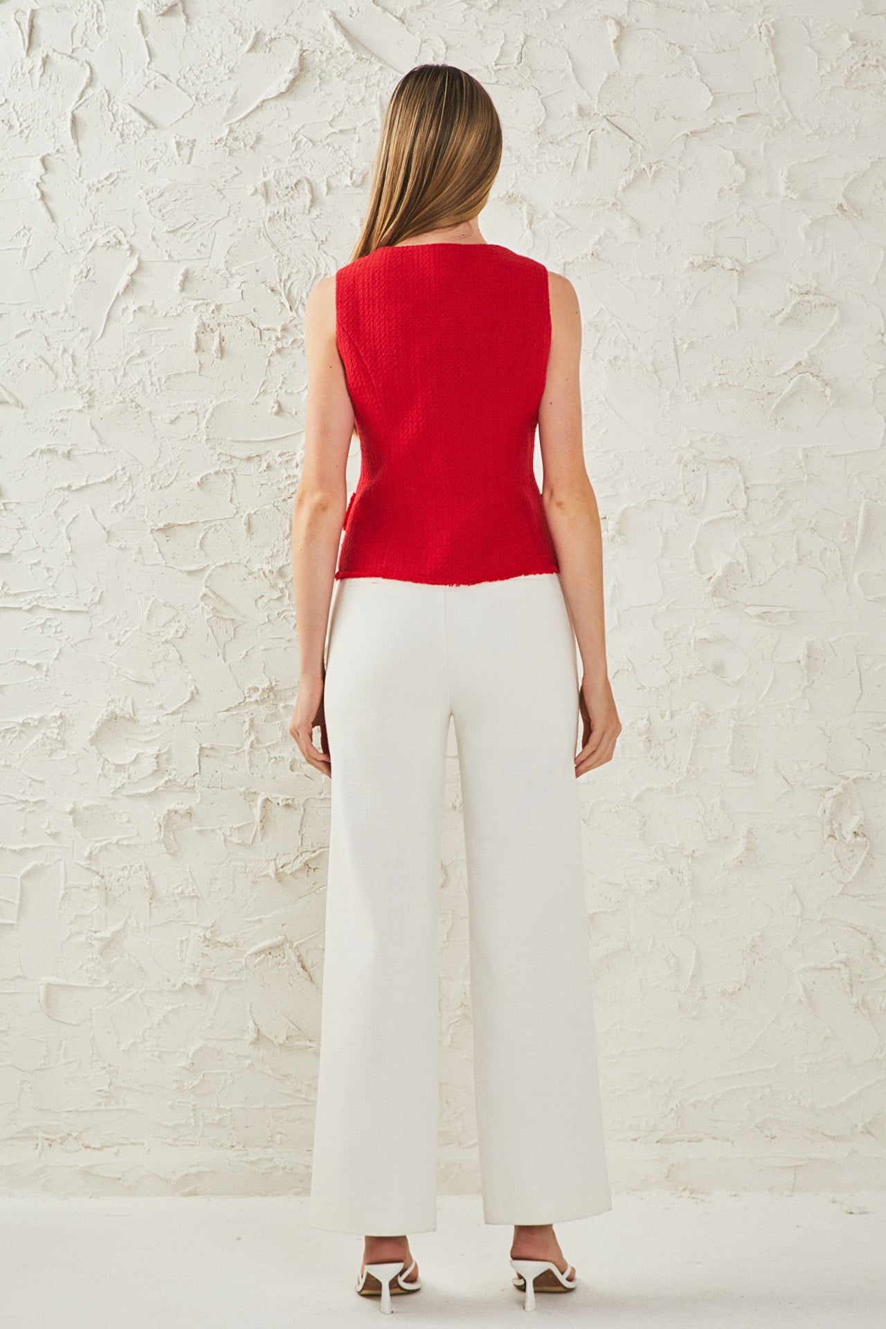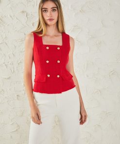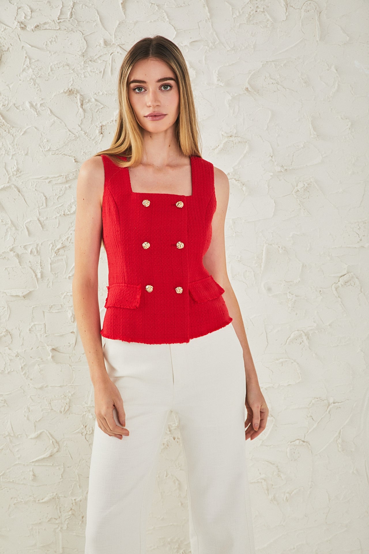 This chic Tweed Fringed Double Button Top is sure to make a statement. With a flattering square neckline, sleeveless design and double breast button front, this top is perfect for a fashionable yet professional look. Constructed of textured tweed fabric, this top has statement-making fringed trim that will elevate any outfit. Show off your style with this unique and timeless piece.