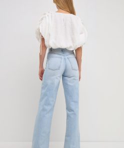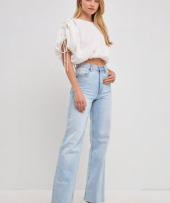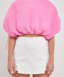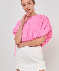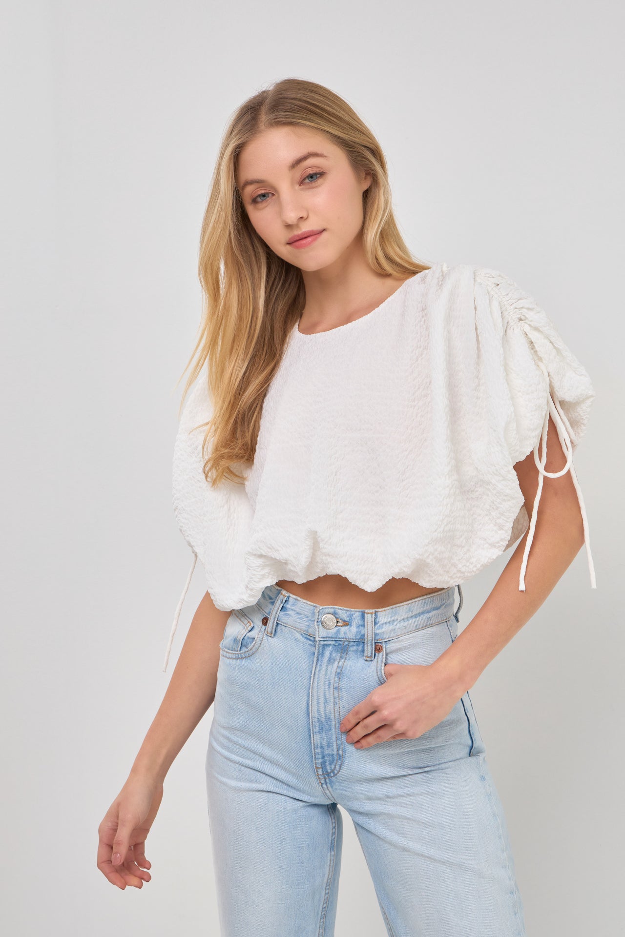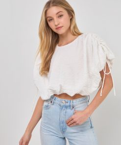 Amp up your everyday style with this voluminous cropped top. We love the textured fabric and functional drawstrings on this top. The balloon silhouette is key for a feminine and flattering fit, while the round neckline and back keyhole give it a touch of elegance. Style this top with everything from jeans to skirts.